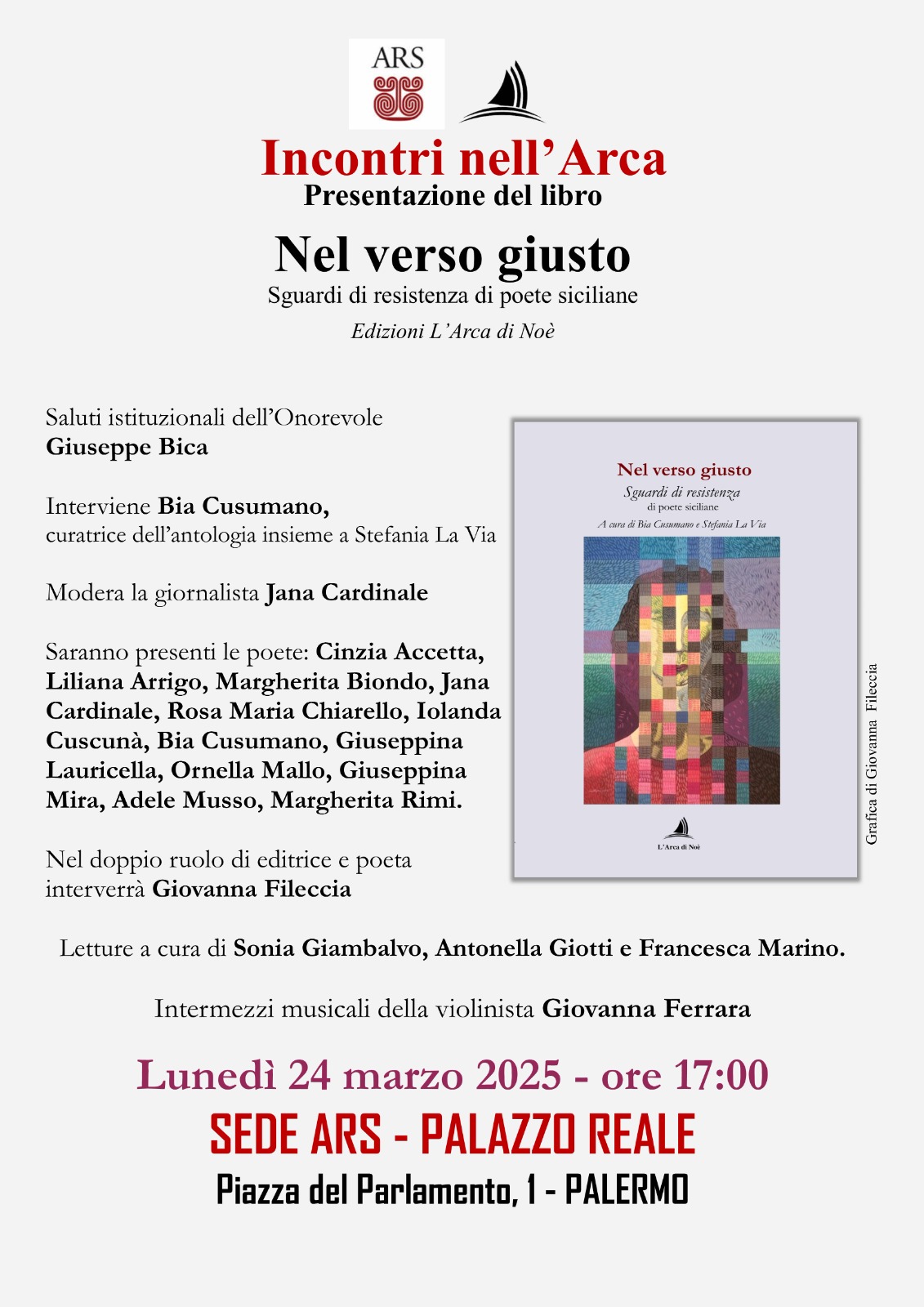 “Nel verso giusto. Sguardi di resistenza di poete siciliane” è il titolo della collettanea che, lunedì 24 marzo alle 17:00, sarà presentata a Palazzo Reale, sede dell’Assemblea Regionale Siciliana.