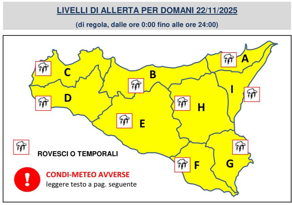 AGRIGENTO – Il Dipartimento Regionale di Protezione Civile (DRPC) ha diramato oggi l’Avviso per il rischio meteo-idrogeologico – Allerta Gialla, identificato come Condizioni Meteo Avverse n. 25325 del 21/11/2025, con validità dalle ore 16:00 di oggi fino alla mezzanotte del 22 novembre.