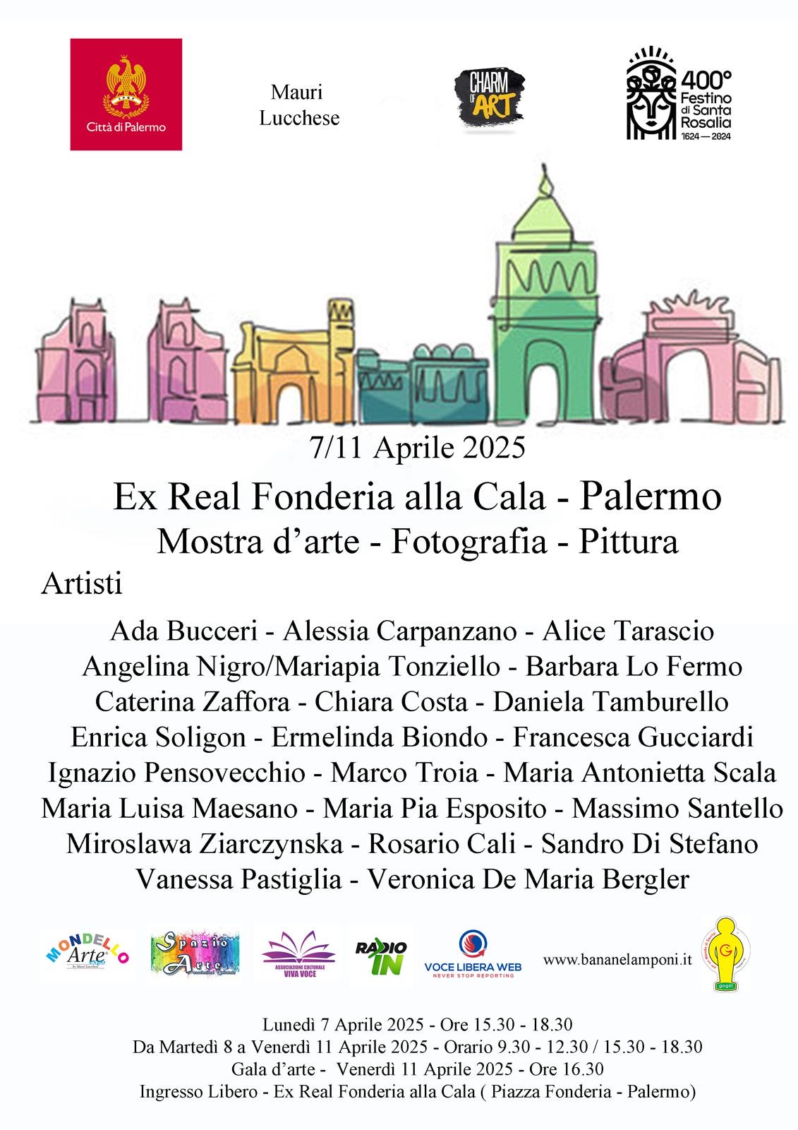 Ada Bucceri, Alessia Carpanzano, Alice Tarascio, Angelina Nigro, Mariapia Tonziello, Barbara Lo Fermo, Caterina Zaffora, Chiara Costa, Daniela Tamburello, Enrica Soligon, Ermelinda Biondo, Francesca Gucciardi, Ignazio Pensovecchio, Marco Troia, Maria Antonietta Scala, Maria Luisa Maesano, Maria Pia Esposito, Massimo Santello, Miroslawa Ziarczynska, Rosario Cali, Sandro Di Stefano, Vanessa Pastiglia e Veronica De Maria Bergler sono gli artisti protagonisti della mostra d’arte collettiva in programma a Palermo dal 7 all’11 aprile.