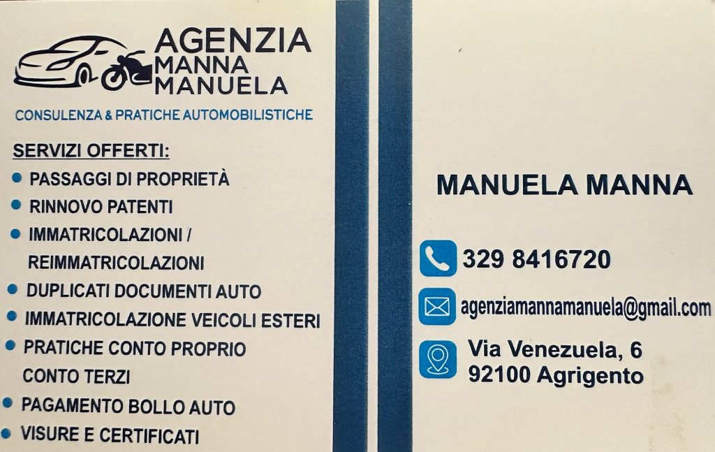 Ha aperto ufficialmente le porte ad Agrigento la nuova Agenzia Manna Manuela, specializzata nel disbrigo di pratiche automobilistiche e nei servizi dedicati agli automobilisti e motociclisti. La sede si trova in Via Venezuela n. 6, nel cuore del quartiere di San Giusippuzzo, facilmente raggiungibile e dotata di accesso comodo anche per persone con ridotta mobilità.