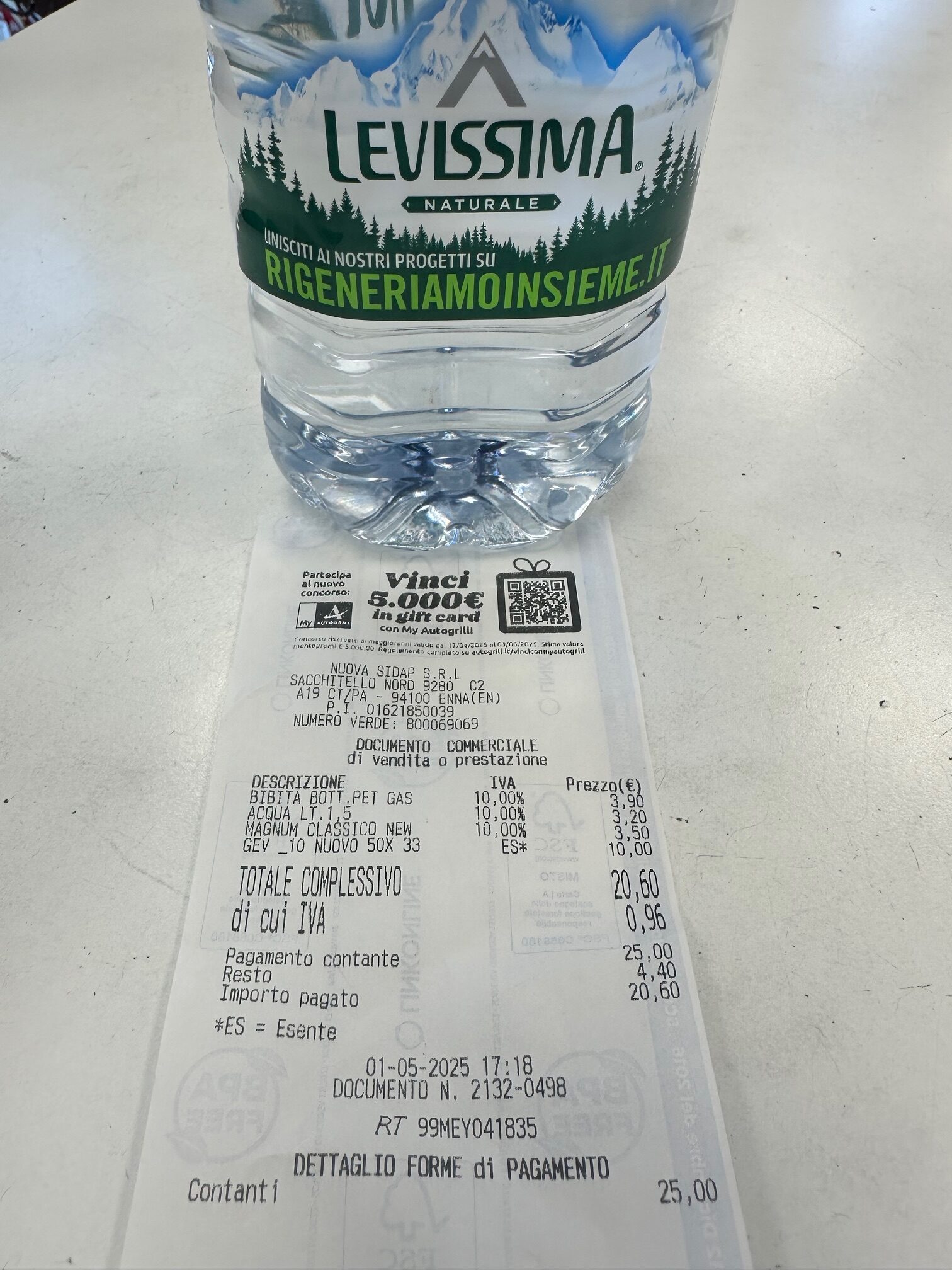 AGRIGENTO – Pagare 3,20 euro per una bottiglia d’acqua da 1,5 litri è una realtà che ha dell’assurdo, ma è ciò che accade quotidianamente nelle aree di servizio autostradali italiane. Lo dimostra lo scontrino fotografato da un cittadino in viaggio, che ha acquistato una bottiglia di Levissima naturale presso una stazione di servizio sulla A19 Palermo-Catania, all’altezza di Enna, dove il prezzo ha raggiunto livelli oltre ogni logica di mercato.