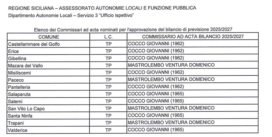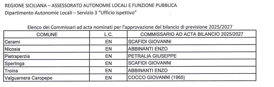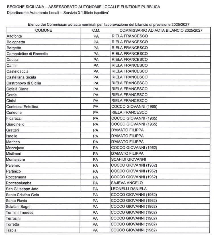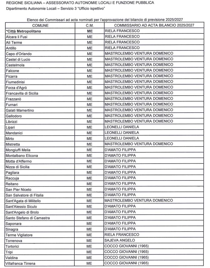 La Regione Siciliana ha ufficialmente nominato i commissari ad acta incaricati di approvare i bilanci di previsione 2025/2027 nei Comuni inadempienti delle nove province dell’isola. L’Assessorato delle Autonomie Locali e della Funzione Pubblica ha pubblicato gli elenchi suddivisi per provincia, incaricando figure già esperte in materia contabile e amministrativa. Un intervento resosi necessario per garantire la continuità amministrativa e il rispetto delle scadenze previste dalla normativa vigente.