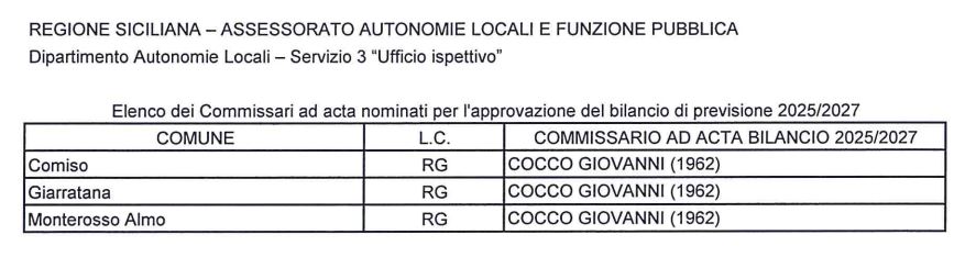 Il dott. Giovanni Cocco (1962) è stato incaricato per tutti e tre i comuni inseriti nell’elenco: Comiso, Giarratana e Monterosso Almo.