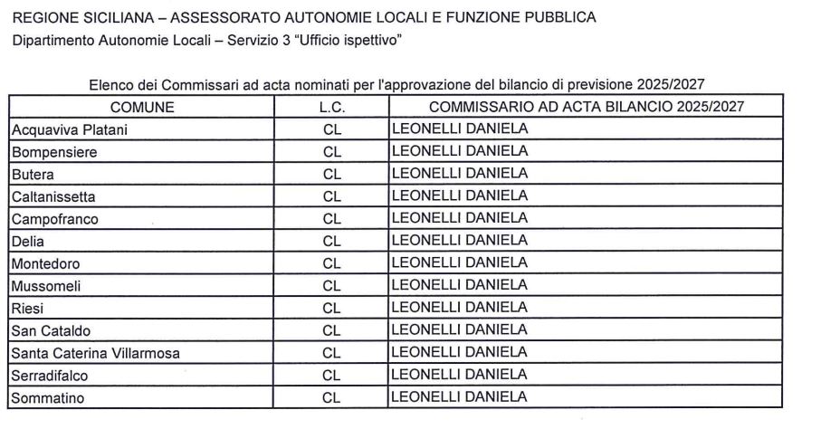 Nel nisseno, la dottoressa Daniela Leonelli sarà la responsabile unica per l’approvazione dei bilanci in tutti i comuni, tra cui San Cataldo, Mussomeli, Gela e la stessa Caltanissetta. Una centralizzazione che punta all’efficienza.