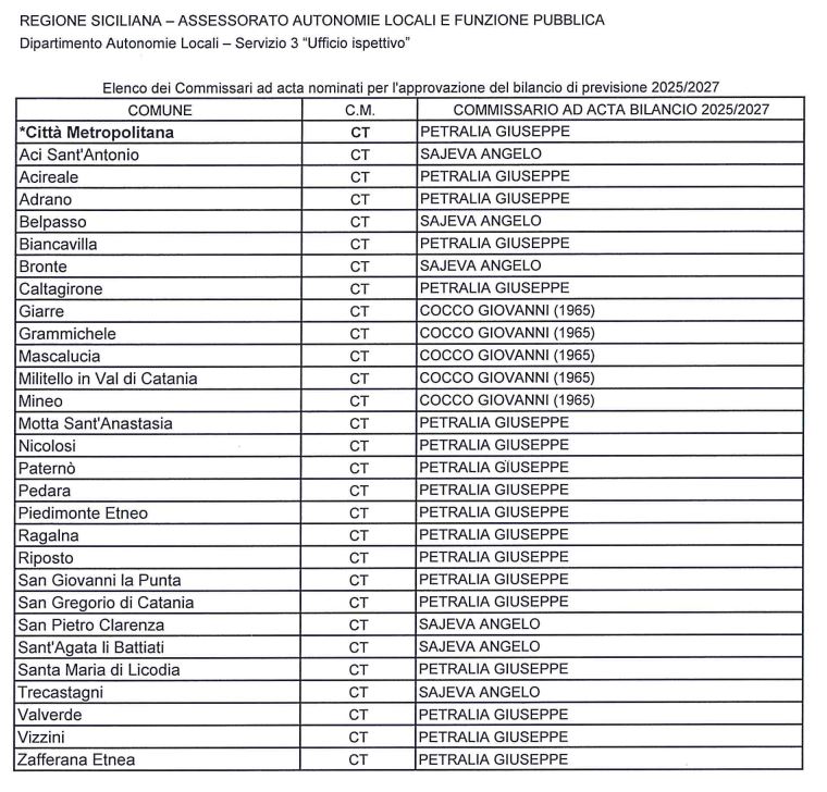 Nella città metropolitana etnea, i commissari nominati sono Giuseppe Petralia, Giovanni Cocco, Angelo Sajeva e altri. Petralia è il più presente, assegnato a diversi comuni come Paternò, Acireale e Caltagirone. Cocco Giovanni (classe 1965) copre invece comuni come Giarre, Mascalucia e Mineo. Sajeva interviene nei territori di Aci Sant’Antonio, Bronte e Trecasagni.