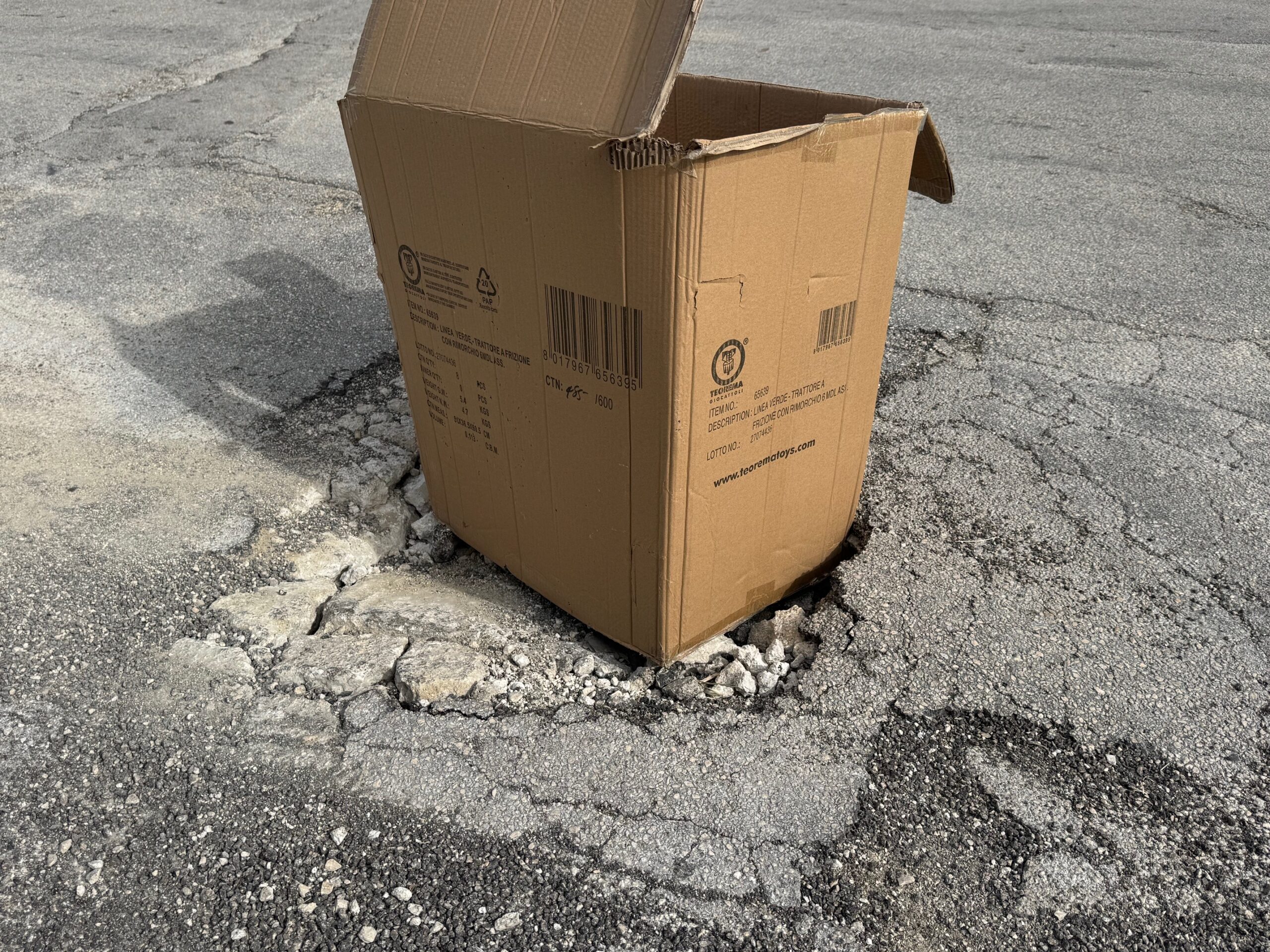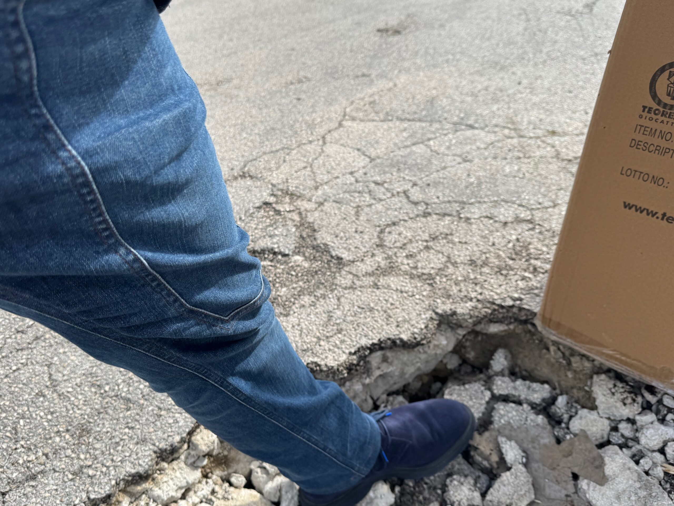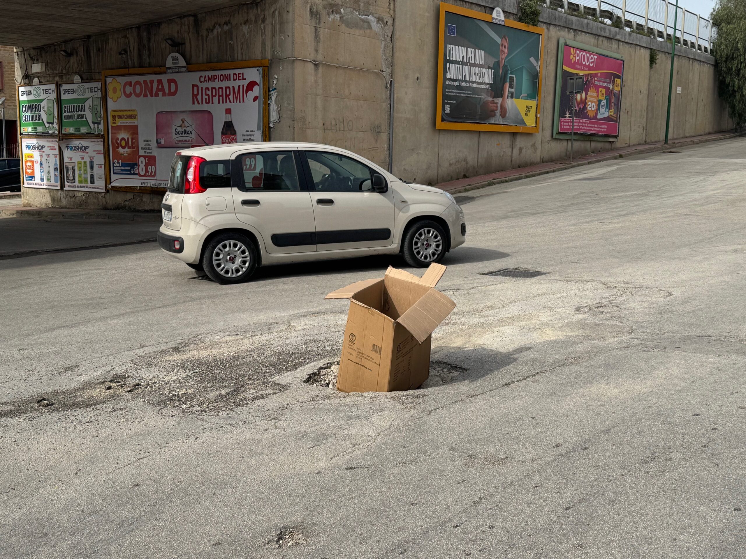 Uno degli episodi più emblematici è la buca di oltre un metro quadrato per una profondità di circa 15 cm, segnalata dai cittadini in modo quasi surreale: un cartone posizionato sopra il cratere, come se fosse l’unico rimedio possibile per avvertire chi transita. Questa situazione è lo specchio del degrado della viabilità urbana, mentre l’amministrazione comunale continua a parlare di milioni di euro destinati alla manutenzione stradale, senza però alcun riscontro concreto sulle strade cittadine.