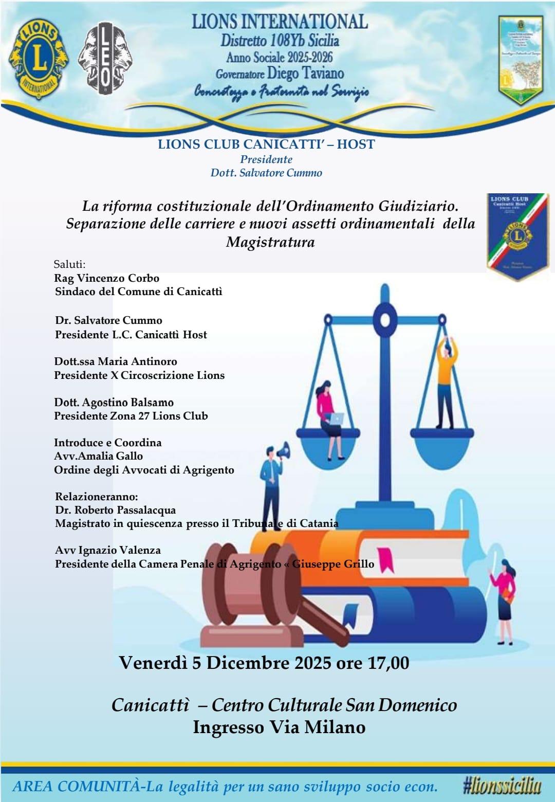 CANICATTÌ – Un appuntamento di alto profilo giuridico e culturale quello organizzato dal Lions Club Canicattì Host, presieduto dal dott. Salvatore Cummo, che si terrà venerdì 5 dicembre 2025 alle ore 17:00 presso il Centro Culturale San Domenico, con ingresso da via Milano.