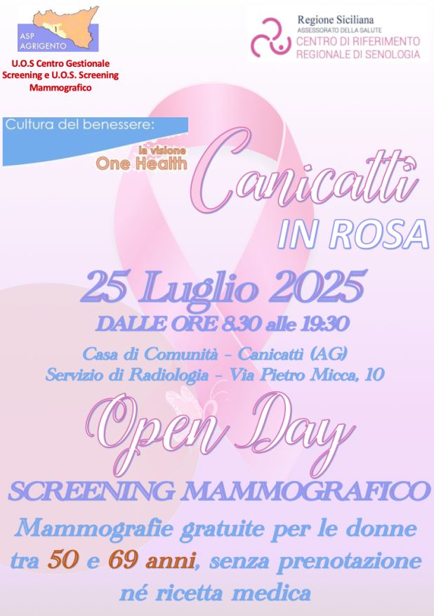 CANICATTÌ (AG) – Dopo il boom di presenze registrato a Sciacca, Agrigento e Licata, domani venerdì 25 luglio 2025 la campagna straordinaria di prevenzione oncologica dell’ASP di Agrigento farà tappa a Canicattì, con un nuovo Open Day dedicato allo screening mammografico.