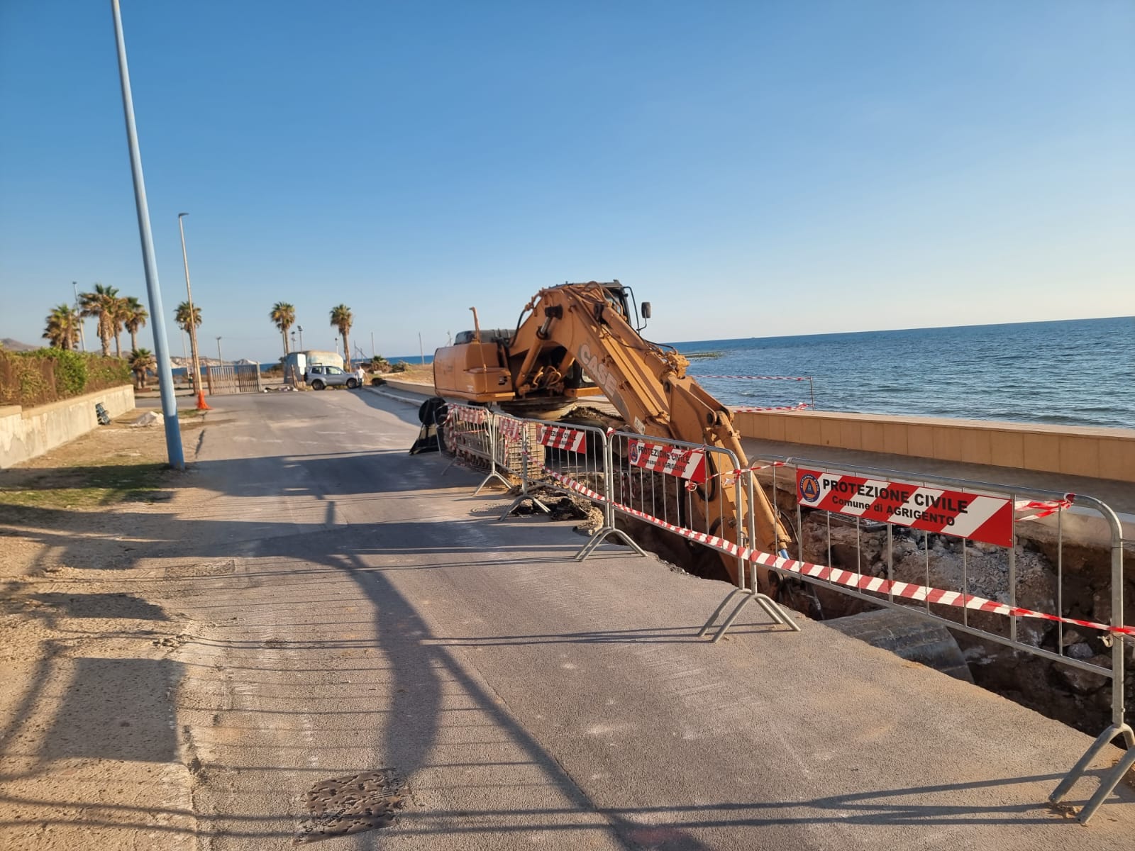 Agrigento – Dopo settimane di segnalazioni e fotografie che documentavano la pericolosa voragine apertasi sul lungomare di Cannatello, in via Farag, finalmente sono iniziati i lavori di messa in sicurezza. Le ruspe sono entrate in azione e il tratto stradale, transennato da giorni, è stato completamente scavato per permettere la ricostruzione del sottofondo e la sistemazione delle condutture.