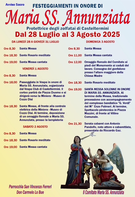 Casteltermini si prepara a vivere una settimana intensa di fede, tradizione e spettacolo in onore di Maria Santissima Annunziata, protettrice degli zolfatai. Dal 28 luglio al 3 agosto 2025, il centro montano dell’agrigentino sarà animato da un ricco programma religioso e civile, culminante nella serata conclusiva di domenica 3 agosto in piazza Duomo.