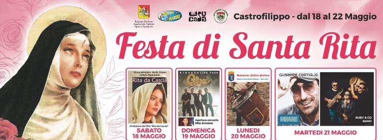 Castrofilippo in festa per celebrare Santa Rita da Cascia, la protettrice dei casi impossibili, nei confronti della quale in paese è alta la devozione. Quest’anno oltre ai tradizionali riti religiosi gli organizzatori hanno affiancato una serie di iniziative collaterali per rendere la festa ancora più partecipata da parte dei fedeli.  Si inizia domani 18 maggio alle 19 in piazza Savatteri con la distribuzione delle rose di Santa Rita provenienti direttamente da Cascia. Alle 21 proiezione del film Rita da Cascia. Domenica 19 maggio alle 11 distribuzione delle Rose, alle 18 Santa Messa solenne all’aperto. Alle 20.30 in viale Bonfiglio serata musicale che sarà aperta da Mia Arnone. A seguire 21.30 concerto dei “I Collage”. Lunedì 20 dopo la santa messa esibizione per le vie di Castrofilippo degli sbandieratori e dei tammurinara di Delia. Martedì 21 in viale Bonfiglio alle 20.30 serata di Cabaret con Giuseppe Castiglia che sarà accompagnato dal gruppo musicale “Ruby & Co”. Mercoledì le iniziative vedranno momenti esclusivamente religiosi. Alle 10 in piazza Savatteri distribuzione delle rose di Santa Rita, a seguire alle 11 la Santa Messa, alle 12 supplica a Santa Rita e benedizione delle Rose. Alle 17.30 Santa Messa con predica del diacono Carmelo Amalfitano. Al termine la processione del simulacro di Santa Rita accompagnato dalla banda musicale. Al rientro i fuochi d’artificio. Anche quest’anno così così come nel passato le celebrazioni sono state fortemente volute dalla famiglia Brucculeri di Castrofilippo.  Hanno collaborato le associazioni: “Usu Casa”, “Pi Nichi e Pi Ranni”, “Giubbe  Verdi”  con il patrocinio dell’assessorato al turismo della Regione Siciliana.