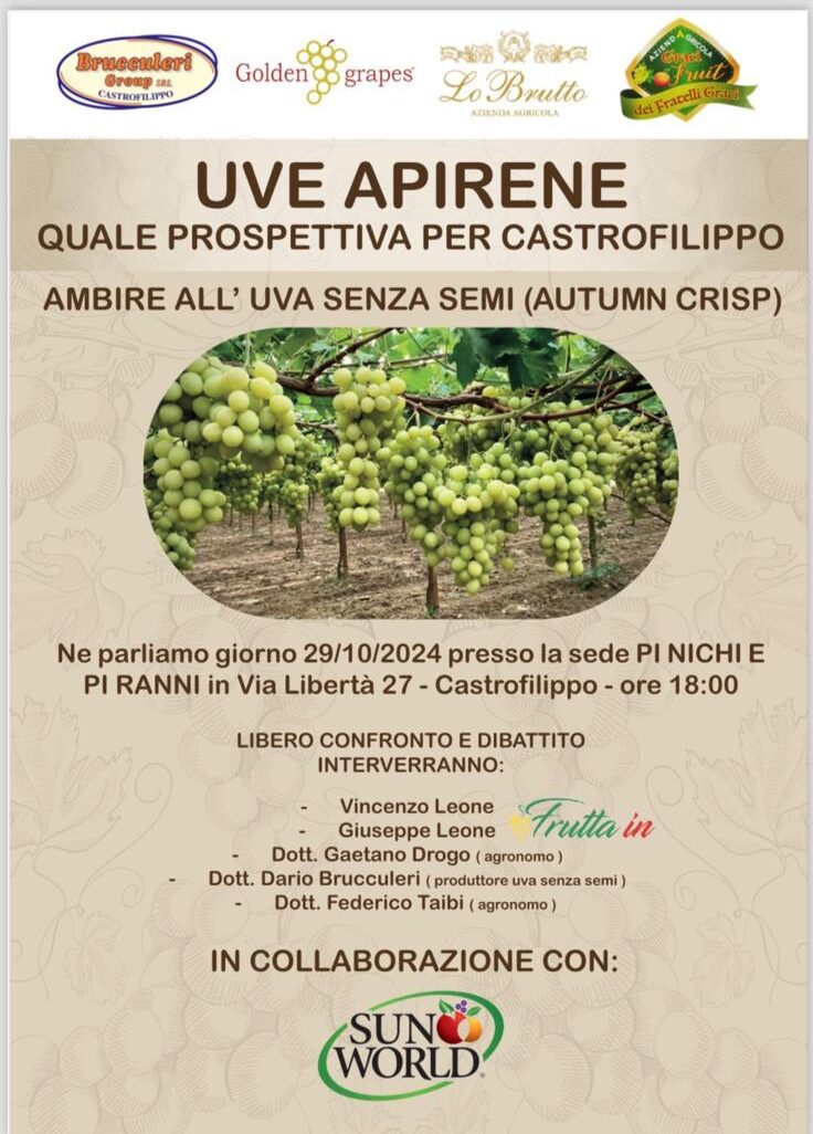 Il prossimo martedì 29 ottobre, a Castrofilippo, si terrà un convegno dal titolo “Uve Apirene: quali prospettive per Castrofilippo. Ambire all’uva senza semi (Autumn Crisp)”, che vedrà esperti del settore confrontarsi sul futuro della coltivazione dell’uva da tavola senza semi. L’iniziativa, organizzata da Brucculeri Group, Golden Grapes, l’azienda agricola Lo Brutto e l’azienda agricola Fratelli Graci, in collaborazione con Sun World, avrà luogo presso la sede dell’associazione “Pi Nichi e Pi Ranni” in via Libertà, con inizio previsto per le ore 18.