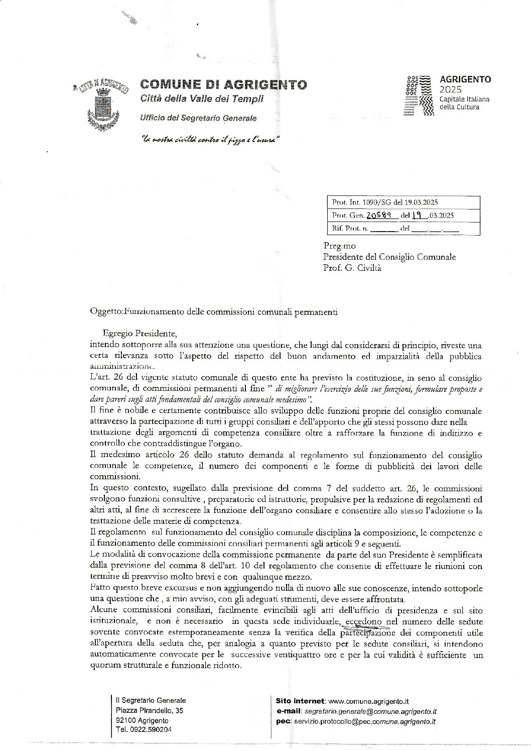 L’Amministrazione e il Consiglio comunale, alla luce della lettera della segretaria generale e dei fatti noti o in corso di accertamento, hanno il dovere di fare chiarezza. I cittadini di Agrigento meritano trasparenza, legalità e coerenza, specialmente da chi è chiamato a governare.
