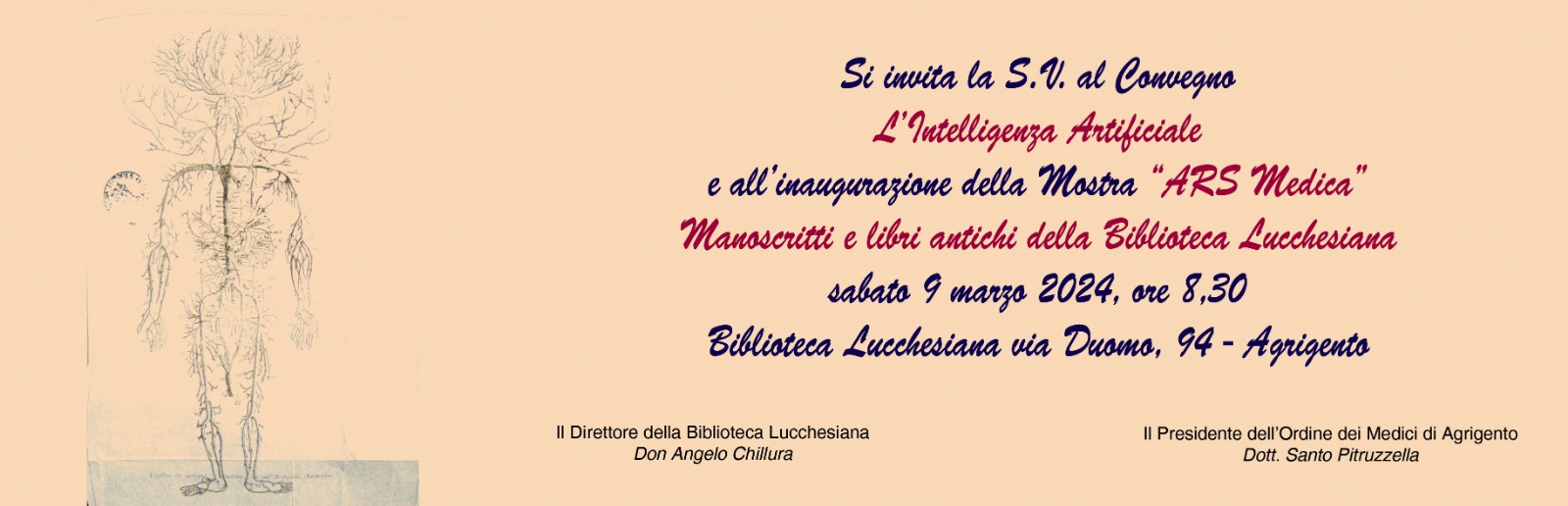 Sabato prossimo, alle 9:30, nella sala monumentale della Biblioteca Lucchesiana, si terrà il convegno sul tema “Intelligenza Artificiale: aspetti medici ed etici” promosso dalla Biblioteca Lucchesiana, diretta da don Angelo Chillura, dall’Ordine dei medici chirurghi e odontoiatri (Omceo) di Agrigento, presieduto da Santo Pitruzzella, e patrocinato dal Parco Archeologico e Paesaggistico Valle dei Templi.