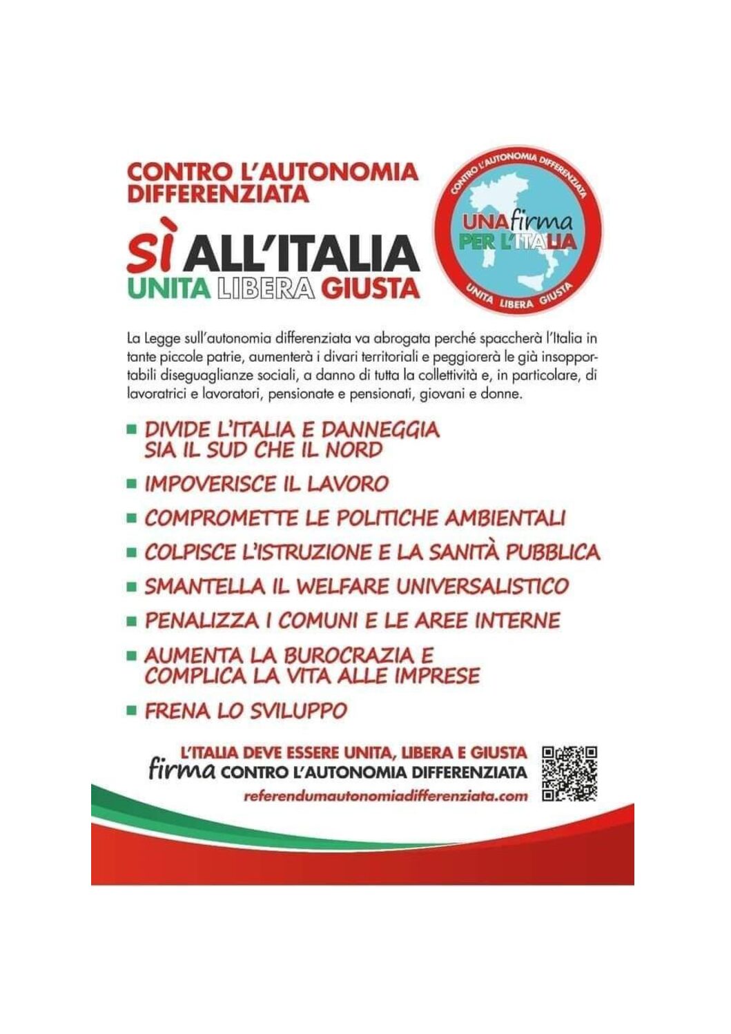 Si è costituito ieri il coordinamento cittadino del comitato referendario per l’abrogazione della legge sull’autonomia differenziata. A partire da sabato prossimo, saranno creati dei puntidi incontro coni cittadini, sia a San Leone che in centro città, dove sarà possibile apporre la firma per chiedere lo svolgimento del referendum abrogativo.