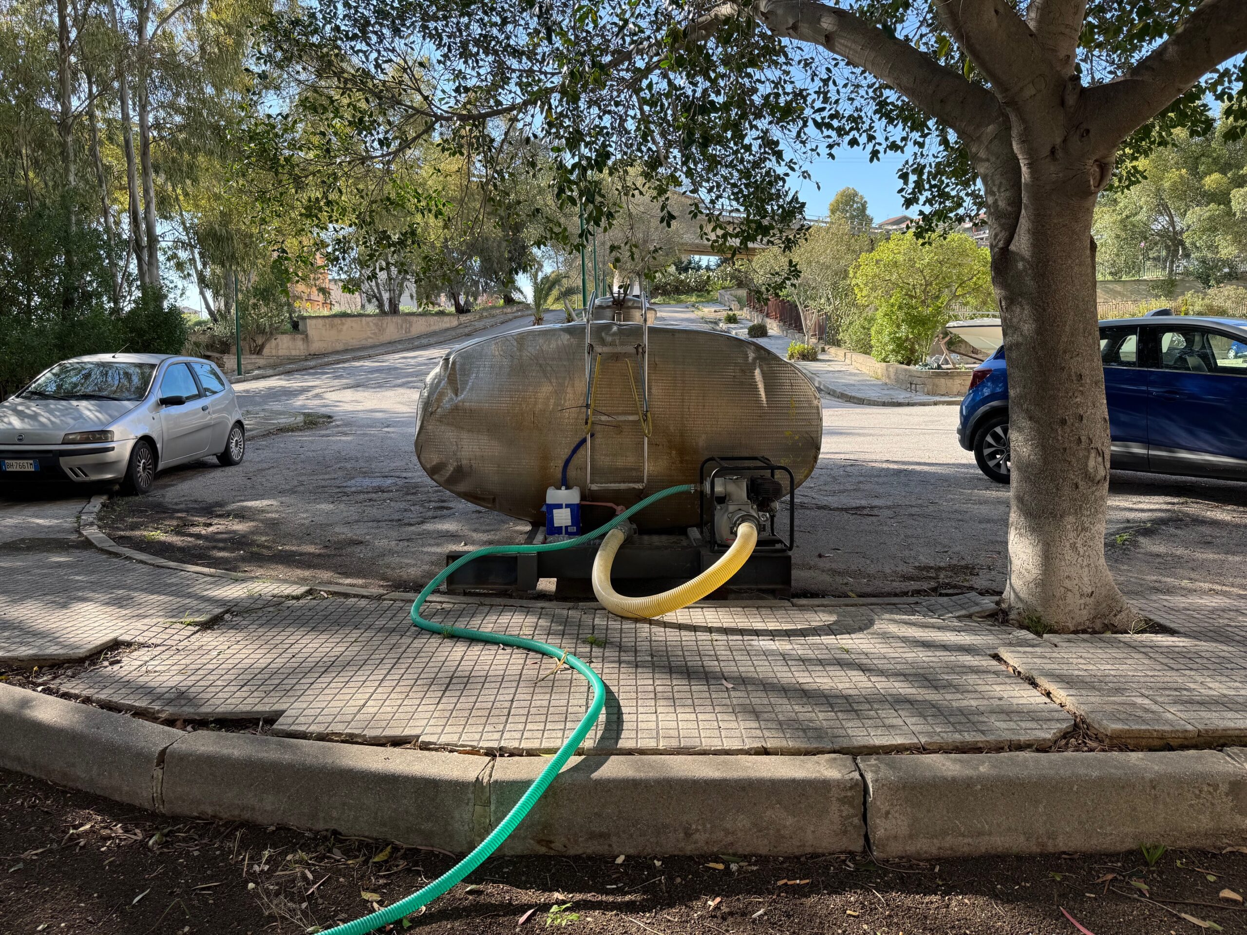 Grazie alla posa a terra della cisterna metallica, un tempo in dotazione – appunto – a un’autobotte di quelle che girano nelle nostre città assetate, i residenti di questo condominio di otto piani riescono a non avvertire oltre misura la sete, derivante dai turni spesso lunghissimi nella distribuzione idrica nel popoloso quartiere. L’acqua contenuta nella cisterna, attraverso un potente “motorino”, viene immessa in un lunghissimo tubo di gomma che raggiunge la parte più alta dello stabile dove – verosimilmente – consente all’acqua di confluire nelle vasche di raccolta. La cisterna pare non essere allacciata alla rete idrica pubblica. Arriva dunque da questa piazza di Fontanelle l’ennesima prova di come ad Agrigento la sete si combatte con i metodi più vari e anche tecnologicamente affascinanti, sfidando perfino la forza di gravità, riuscendo a “sparare” l’acqua fin a un ottavo piano, con un semplice tubo di gomma, allacciato a un motore che necessita ovviamente della manutenzione del caso. Ma pur di potersi lavare, ad Agrigento non ci si risparmia in ingegno.