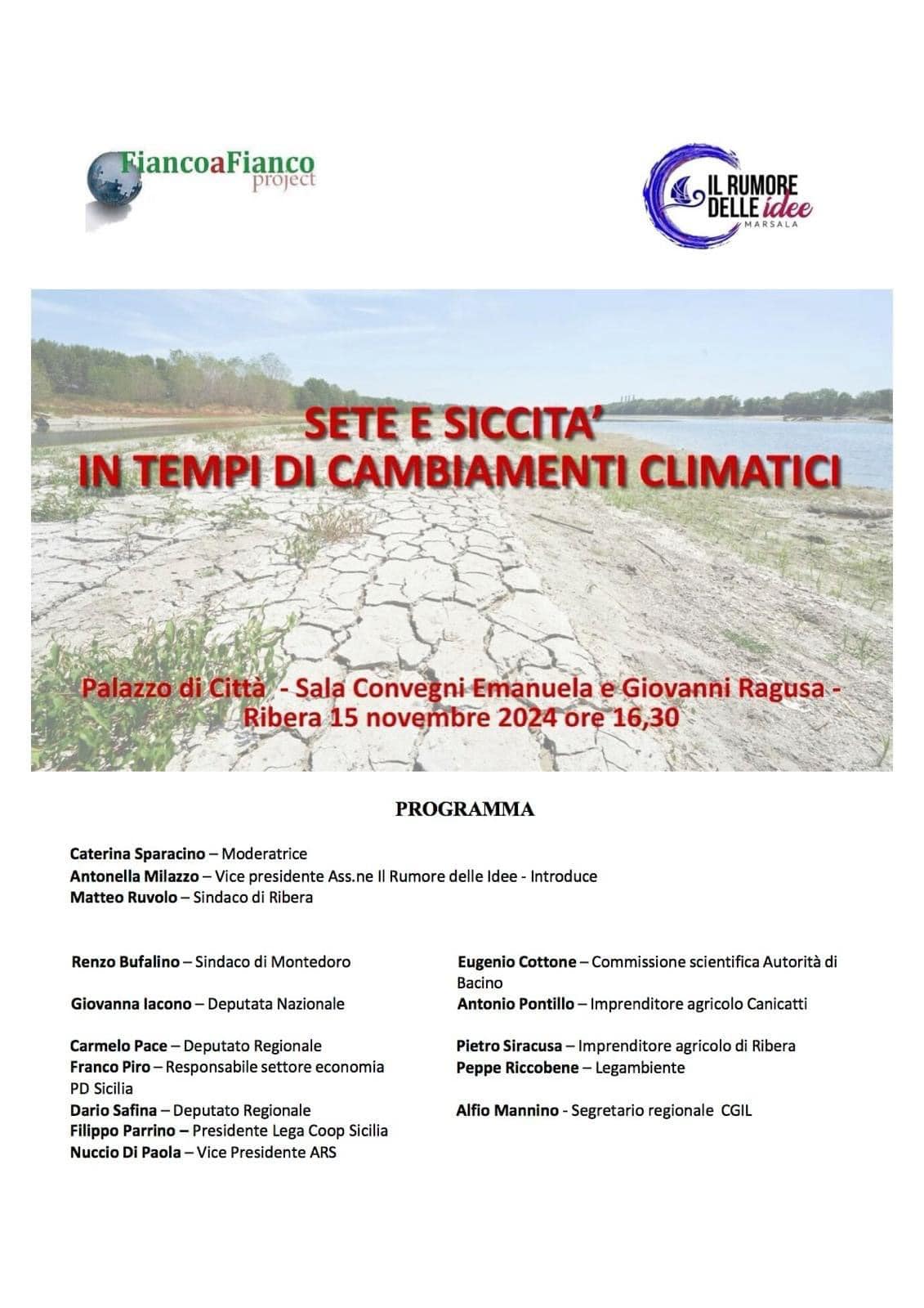 Ribera, 16 novembre 2024 – Si è svolto ieri pomeriggio a Ribera un incontro pubblico di grande partecipazione per affrontare la crisi idrica che attanaglia la Sicilia centromeridionale. L’evento, promosso dalle associazioni “Fianco a fianco” e “Il rumore delle idee”, ha visto la presenza di rappresentanti di associazioni, personalità politiche e istituzionali, agricoltori, imprenditori e numerosi cittadini provenienti non solo dalla provincia di Agrigento, ma anche da quelle di Trapani, Caltanissetta ed Enna, tutte duramente colpite dalla cronica carenza idrica.