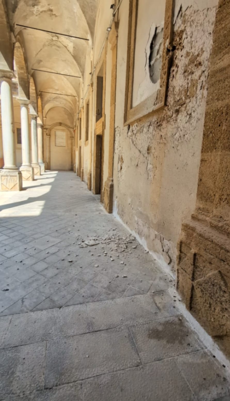 SCIACCA – Solo la fortuna ha evitato la tragedia. Nel pomeriggio, nell’atrio superiore del Comune di Sciacca, ospitato all’interno del seicentesco Palazzo dei Gesuiti, si è verificato il distacco di una porzione di intonaco e calcinacci, precipitati violentemente a terra. Un episodio che poteva trasformarsi in dramma se in quel momento nell’area si fossero trovate persone: turisti in visita, dipendenti comunali, cittadini impegnati in pratiche o persino partecipanti a matrimoni civili ed eventi che lì si svolgono abitualmente.
