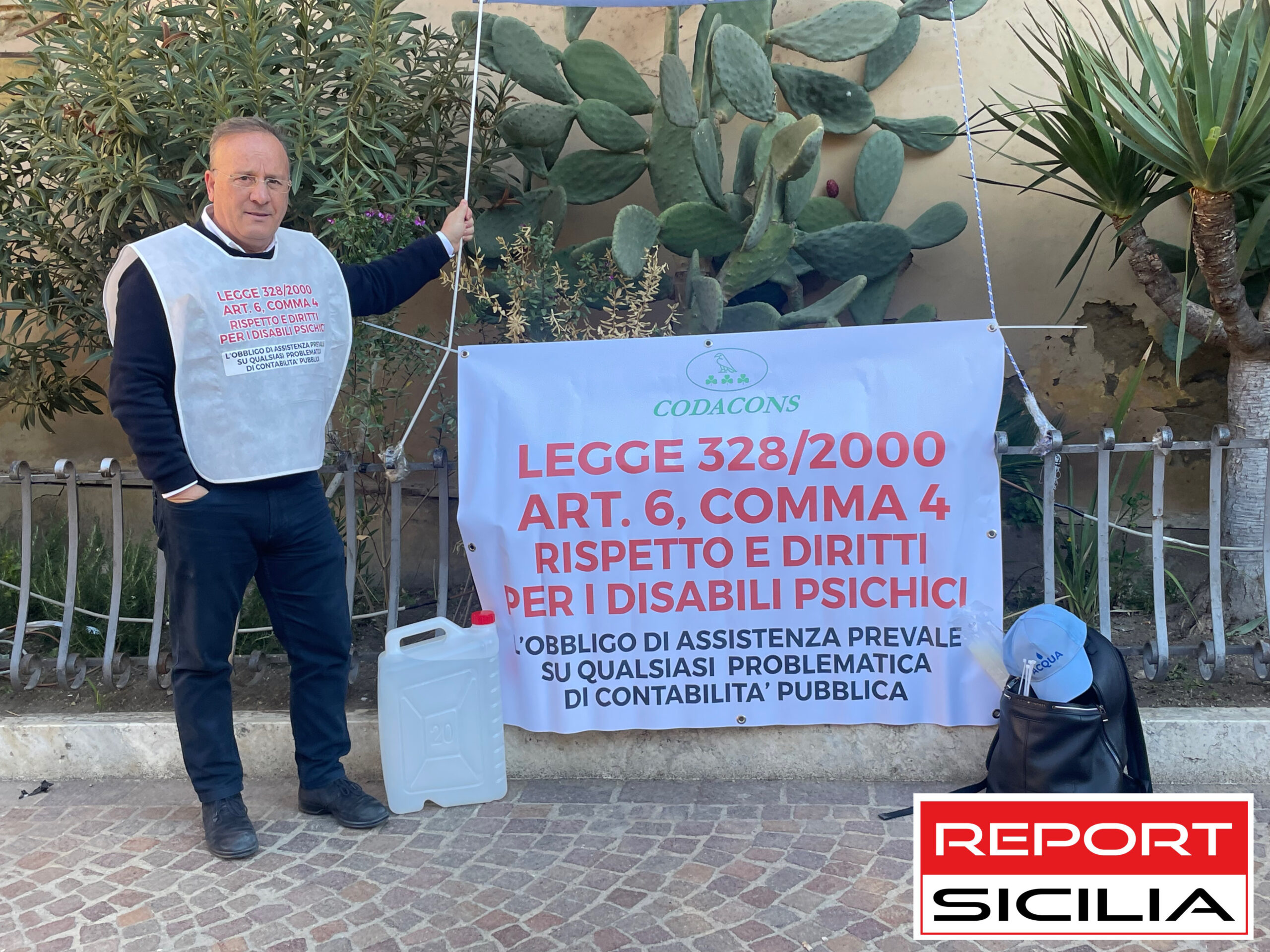 Dalle prime ore di questa mattina Giuseppe Di Rosa Responsabile Regionale del Dipartimento Trasparenza Enti Locali del Codadons manifesta davanti il palazzo di Città, al suo seguito un banner ed un bidone di acqua simbolo del dissenso