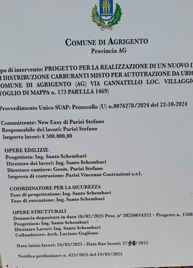 A guardare le foto del cantiere già attivo lungo viale Cannatello, nel quartiere Villaggio Mosè di Agrigento, sorge spontanea una domanda: è tutto regolare? Il cartello di cantiere parla chiaro: si tratta di un progetto per la realizzazione di un nuovo impianto di distribuzione carburanti misto per autotrazione, con un investimento di 500.000 euro, a firma della società “New Easy di Parisi Stefano”, con lavori iniziati il 24 febbraio 2025 e una presunta fine entro ottobre 2025.