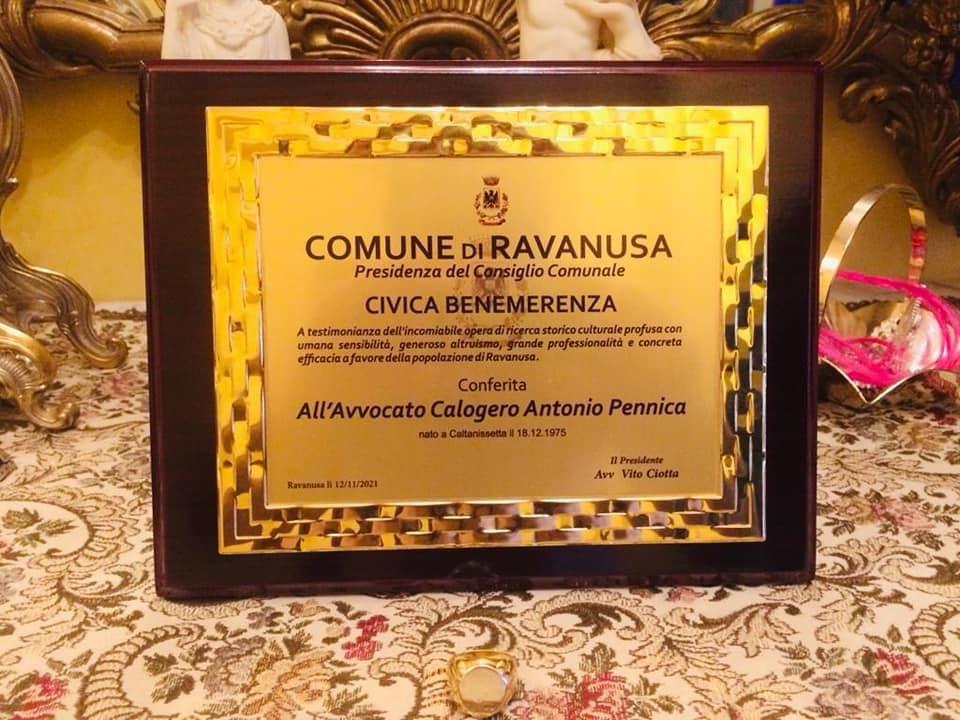 Stilare 2000 biografie dei personaggi più importanti e famosi della propria comunità non è impresa da poco. A riuscirci è stato negli anni l’avvocato Calogero Antonio Pennica di Ravanusa. E per dare pubblico encomio per questa grande opera di salvaguardia della memoria cittadina, la presidenza del Consiglio Comunale del centro saraceno ha conferito al legale una targa premio. Una civica benemerenza che nobilita la sua opera di ricerca storico-culturale dedicata a Ravanusa.