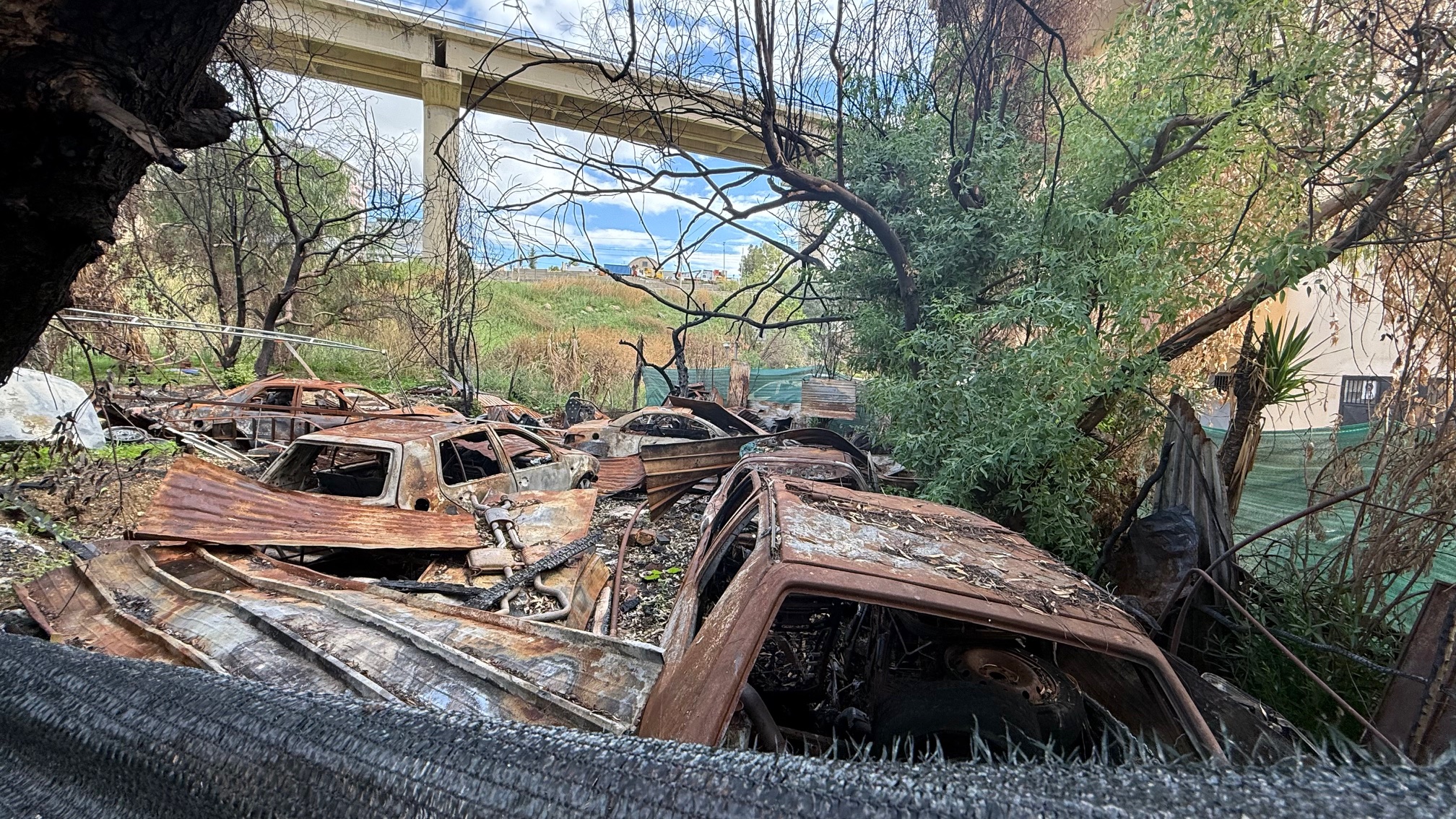 Le carcasse carbonizzate delle auto sono ancora tutte lì, arrugginite e accartocciate, circondate da alberi bruciati e vegetazione annerita.