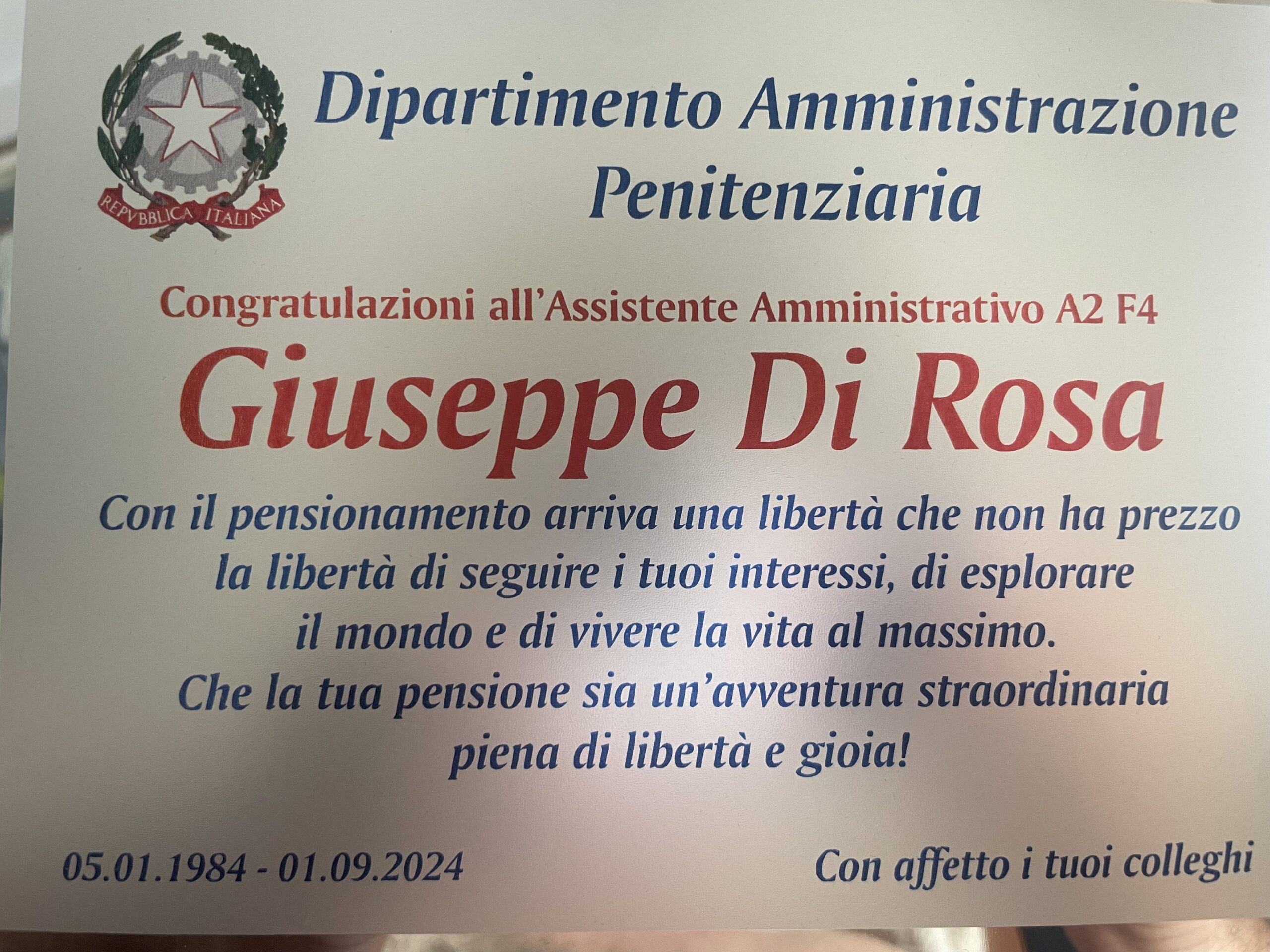 Una pagina importante si chiude oggi per la Casa Circondariale di Agrigento con il pensionamento di Giuseppe Di Rosa, che lascia il servizio dopo 40 anni e 8 mesi di dedizione alla struttura. Di Rosa ha iniziato la sua carriera come agente di polizia penitenziaria, per poi ricoprire il ruolo di assistente amministrativo negli ultimi 30 anni, contribuendo significativamente alla crescita e al miglioramento dell’istituto