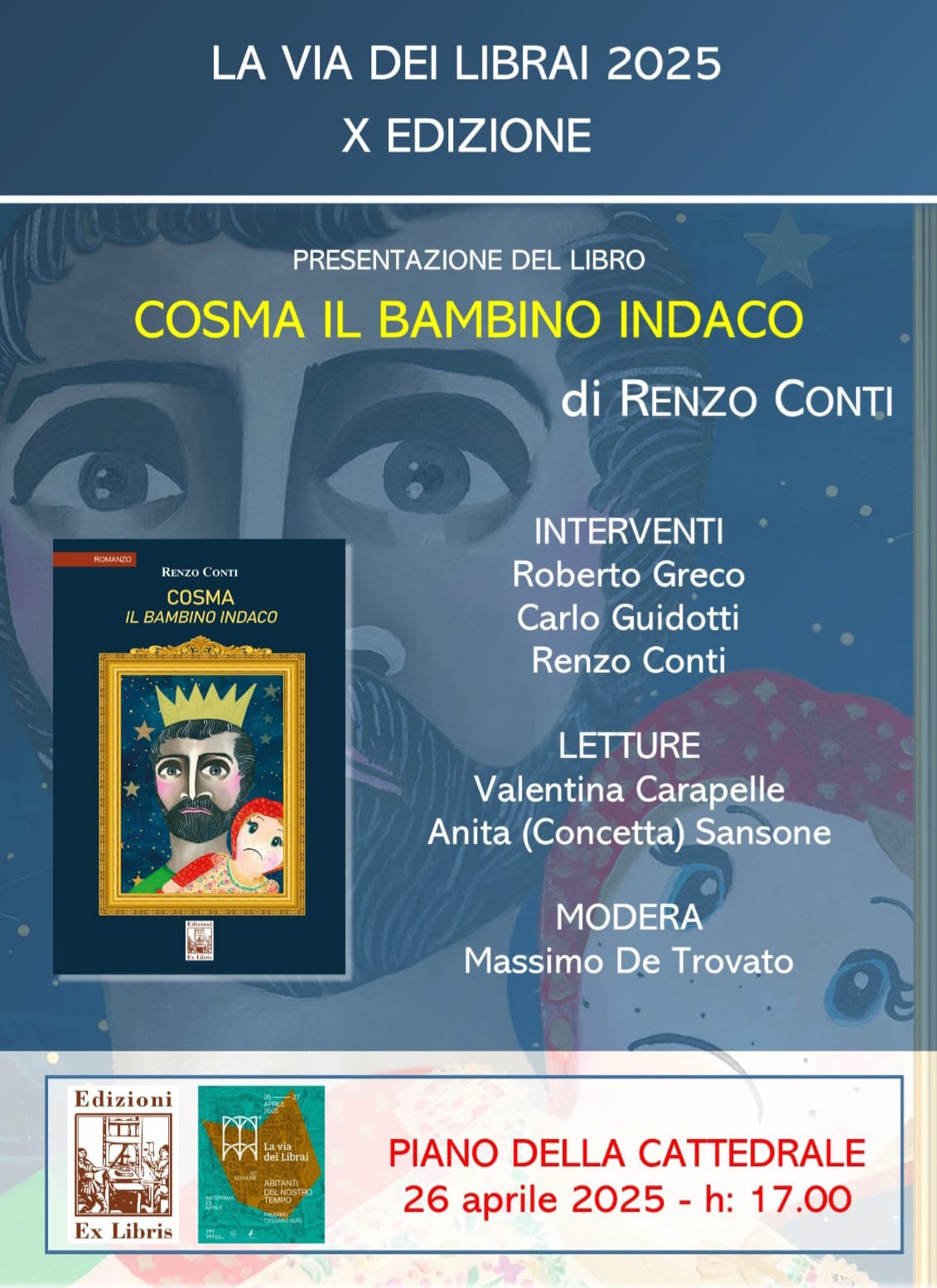 “Cosma il bambino indaco” è il titolo del libro di Renzo Conti che sarà presentato a Palermo in occasione della decima edizione de “La Via dei Librai” sabato 26 aprile alle 17:00, sul piano della Cattedrale.