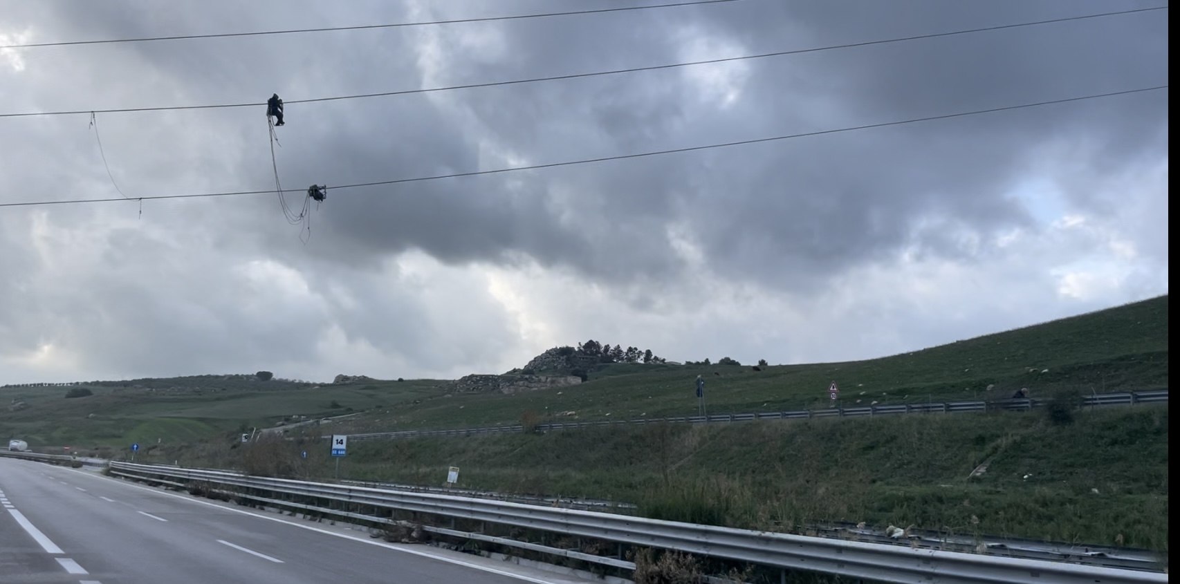 Uno spettacolare intervento di manutenzione sull’alta tensione ha catturato l’attenzione di numerosi passanti lungo la SS 640, all’altezza del Parco Livatino. Due operai specializzati dell’ENEL, in condizioni di massima sicurezza e dotati di attrezzature all’avanguardia, sono stati immortalati mentre operavano direttamente sui cavi elettrici sospesi a diverse decine di metri dal suolo.