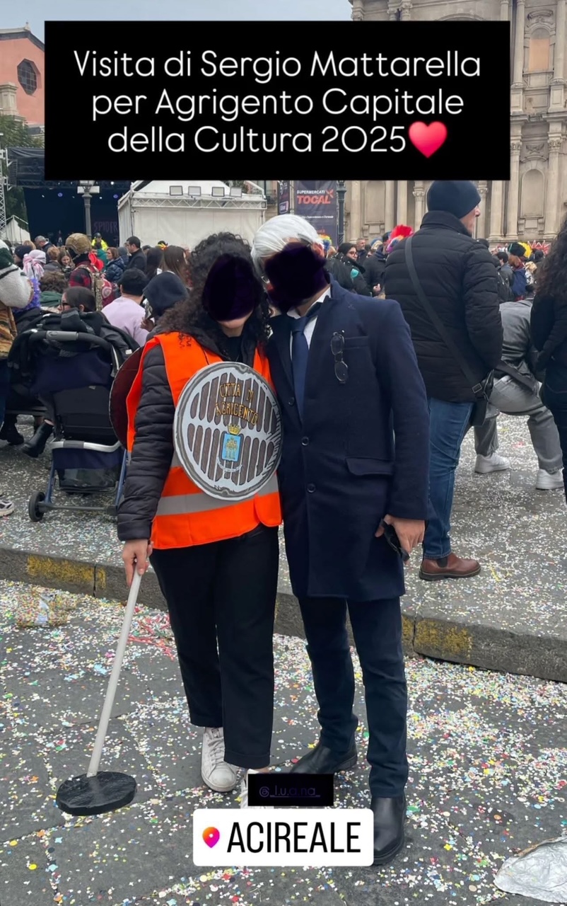 A confermare il livello di notorietà raggiunto dalla vicenda è una foto scattata ad Acireale, in cui si vedono due ragazzi in maschera: uno vestito da “cercatore di tombini” con pettorina arancione e metal detector alla mano, con il simbolo “Città di Agrigento” in evidenza, e l’altro nei panni di un ironico Sergio Mattarella in visita ufficiale per Agrigento Capitale della Cultura 2025.