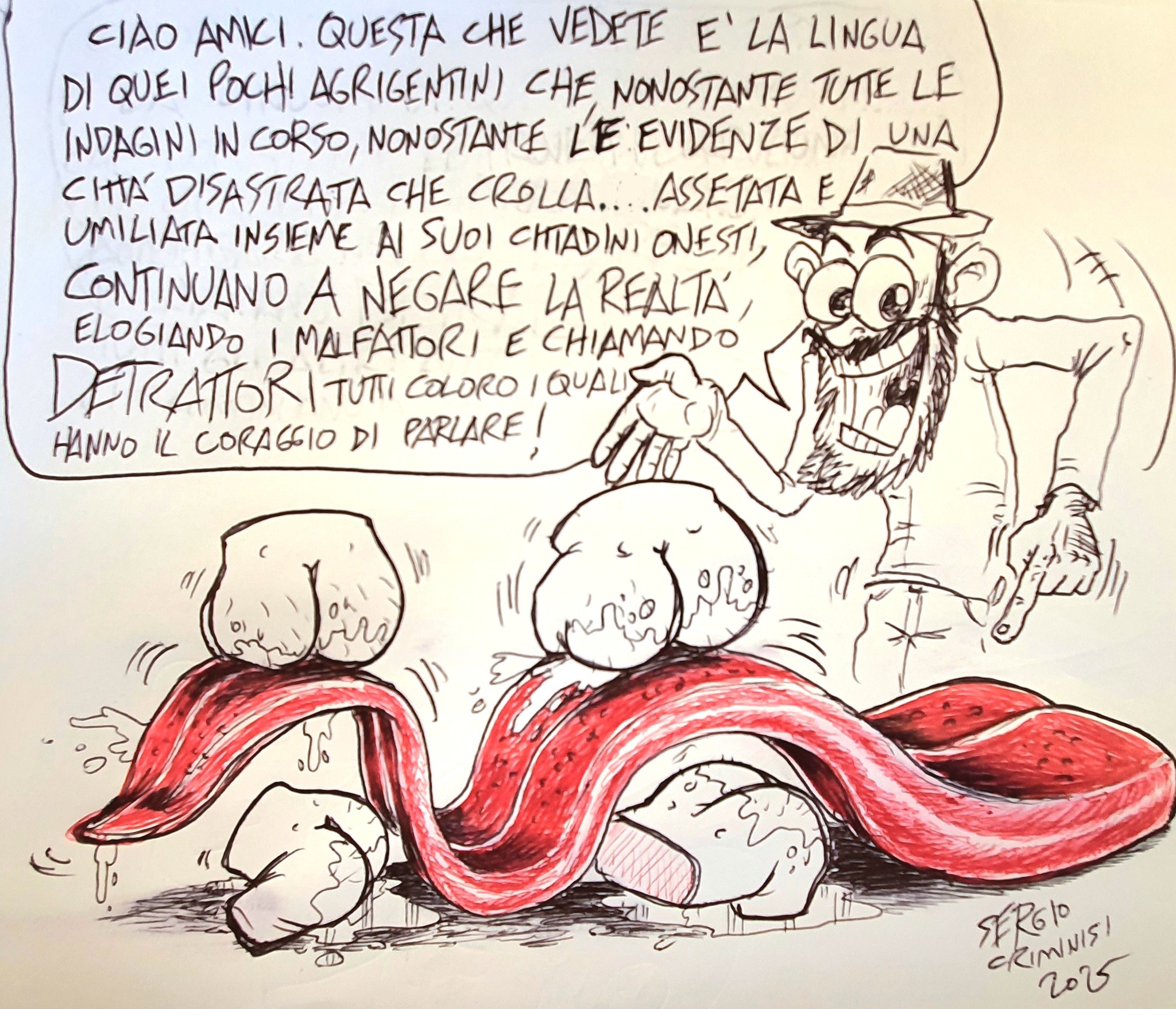 AGRIGENTO – Nella sua rubrica “La notizia vista da Sergio Criminisi”, il nostro pungente e amatissimo vignettista torna a colpire con una tavola satirica che fotografa con ferocia e sarcasmo la situazione politica e sociale agrigentina. La vignetta, intitolata “La lingua degli agrigentini senza dignità”, è un colpo diretto a una parte della città che, nonostante i crolli, la sete, gli scandali e le inchieste in corso, continua a negare l’evidenza e a servire — letteralmente — chi ha affossato la comunità.