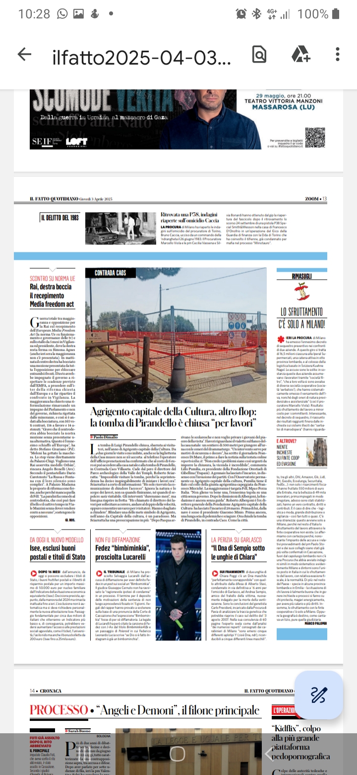 L’incredibile vicenda della tomba di Luigi Pirandello chiusa alle visite nell’anno di Agrigento Capitale della Cultura ha suscitato eco anche a livello nazionale. Primi ad “accorgersi” della gravità della vicenda sono stati i colleghi de “Il Fatto Quotidiano”, con il giornalista Paolo Dimalio. Dopo il nostro “blitz” dell’altroieri nei luoghi del Caos, raccogliendo la notizia e scattando le foto a corredo, il prestigioso quotidiano nazionale ha ritenuto interessante approfondire l’argomento. La tomba di Liugi Pirandello è chiusa e lo sarà per alcune settimane, per consentire un intervento di importante ristrutturazione e messa in sicurezza del vialetto che conduce alla nuda pietra sotto la quale riposano le ceneri del drammaturgo premio Nobel nel 1936. Intervistato da Dimalio, il direttore dell’Ente Parco Archeologico Sciarratta ha evidenziato il proprio disappunto per questa chiusura nel momento sbagliato, scaricando la responsabilità di questa scelta ad altri enti, in primis alla Sovrintendenza ai Beni Culturali. Sempre enti regionali comunque, alla faccia di Agrigento Capitale della Cultura dove uno dei luoghi simbolo viene reso inaccessibile.