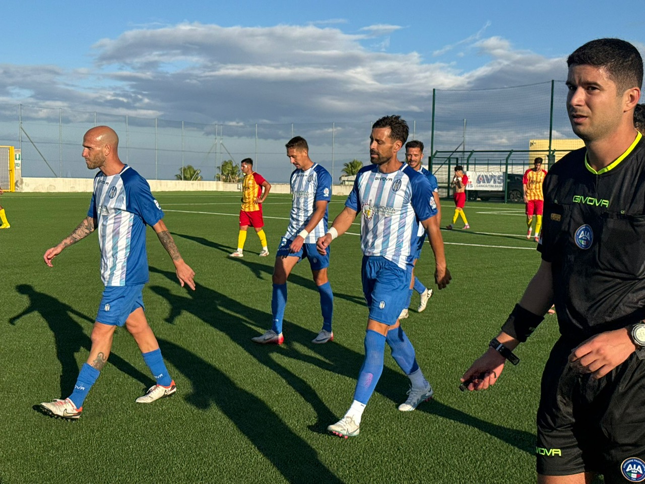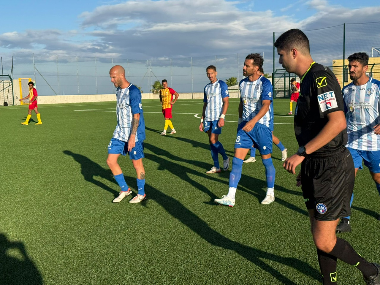 Ma al 15’ del primo tempo arriva l’apertura delle marcature: Ten Lopez, ben servito, non perdona e firma l’1-0 per i biancazzurri. Il match viaggia su ritmi controllati: il Canicattini ci prova da fuori area, ma il portiere ospite Cagnina e la difesa tengono. Al 37’, proprio Martinez salva con un intervento strepitoso su un calcio potente da fuori degli avversari.