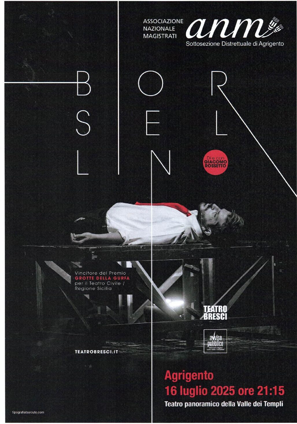 Domani sera alle 21,15, nello scenario del Teatro panoramico della Valle dei Templi andrà in scena lo spettacolo teatrale “Borsellino”. Un evento organizzato dalla sottosezione dell’Anm di Agrigento, l’associazione nazionale magistrati, in vista dell’anniversario della strage di via D’Amelio. In particolare, questa rappresentazione messa in scena dal teatro Bresci consiste in un monologo che riprende il pensiero di Paolo Borsellino, il giudice assassinato da Cosa Nostra assieme ad Agostino Catalano, Eddie Walter Cosina, Vincenzo Li Muli, Emanuela Loi, Claudio Traina, cinque agenti della sua scorta, nella strage del 19 luglio 1992 a Palermo. Sono passati 33 anni da quel maledetto 19 luglio, giorno della strage. Lo spettacolo racconta la vita del magistrato Borsellino attraverso la descrizione dell’uomo Paolo, un uomo tutto d’un pezzo che non accetta compromessi, dal forte rigore morale, un uomo semplice diventato eroe, il cui lavoro però non è ancora finito. Dopo la morte dell’amico e collega Falcone, il coraggio e il profondo senso di giustizia sono ciò che spinge, nonostante la paura, il giudice Paolo Borsellino a compiere fino in fondo il proprio dovere, di magistrato e di persona, perché pubblico e privato nella sua vita sono inscindibili. Tanto è cambiato nella lotta alla mafia, tanto deve ancora cambiare anche alla luce dei mutamenti sopraggiunti in questo trentenni nella stessa cosa nostra e sue ramificazioni. Il teatro Bresci è una compagnia teatrale di professionisti provenienti dal Teatro Stabile del Veneto e dal Piccolo Teatro di Milano: fondata nel 2009 da Giacomo Rossetto, Anna Tringali e Giorgio Sangati. Si occupa della produzione di spettacoli dal vivo, formazione e organizzazione di festival, rassegne ed eventi culturali. Particolare interesse nutre per i grandi classici e il teatro civile. Lo spettacolo è gratuito e non necessita prenotazione. Di questi tempi è tanta roba.