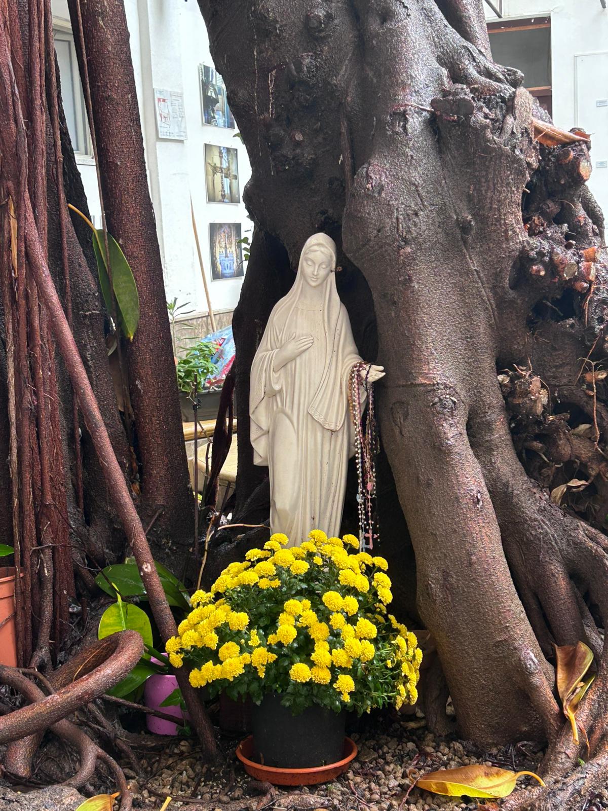 Al centro del cortile sorge un enorme albero che fa da mantello a una statuetta bianca della Madonna circondata da fiori che rende quasi sacro il luogo.
