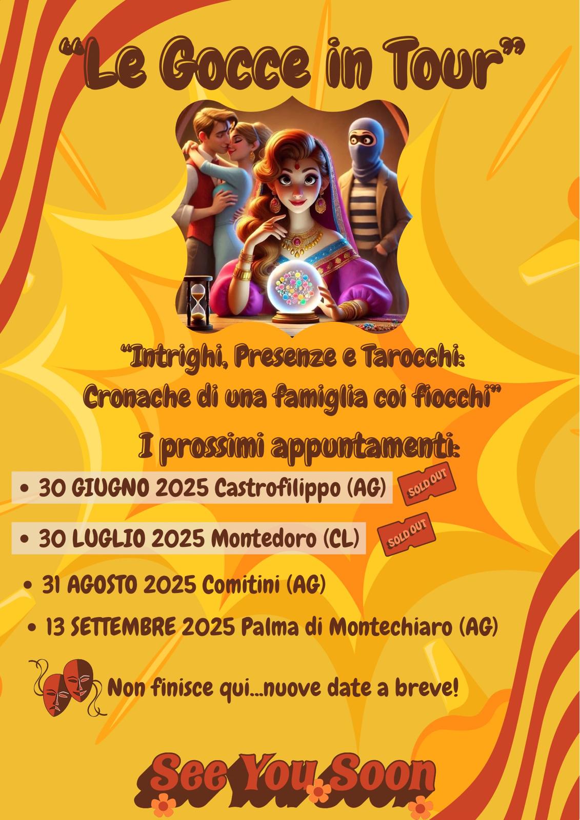 Il tour “Le Gocce in Tour” ha già registrato il tutto esaurito a Castrofilippo (30 giugno 2025) e Montedoro (30 luglio 2025). I prossimi appuntamenti saranno: