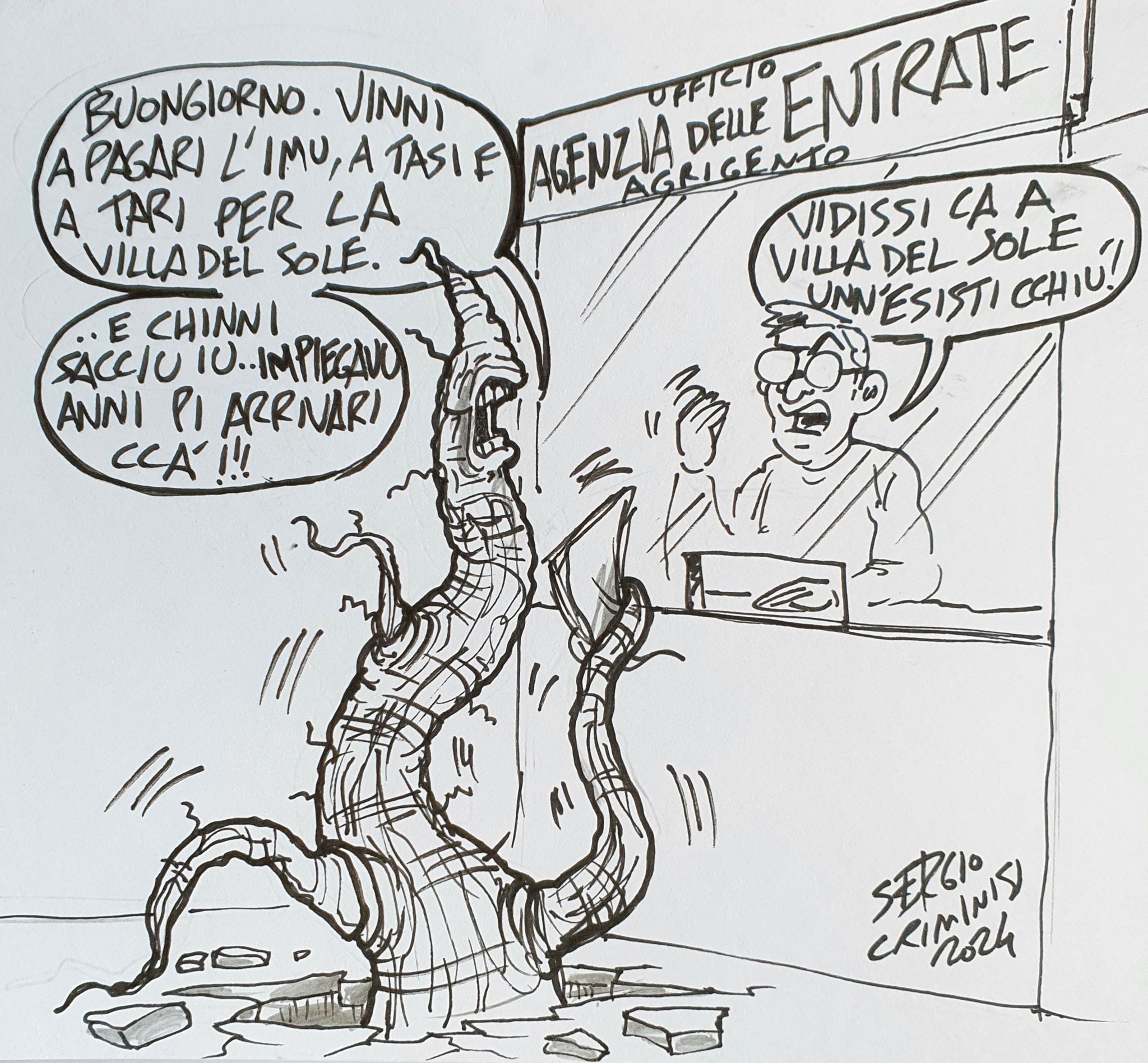 La vignetta di Sergio Crimini, con il suo taglio ironico e pungente, ancora una volta coglie nel segno, trasformando un caso reale in una rappresentazione visiva che fa riflettere e sorridere amaramente. Al centro della scena, un tronco spezzato e deformato, con radici che sembrano gridare giustizia, si presenta all’Agenzia delle Entrate di Agrigento per pagare l’IMU, la TASI e la TARI della Villa del Sole, simbolo di un’ennesima assurdità amministrativa.