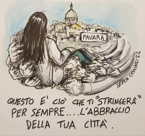 A dare voce – e forma – al sentimento collettivo è ancora una volta Sergio Criminisi, che in una potente e toccante illustrazione raffigura Lorena seduta, di spalle, davanti alla sua città. Non è sola. La città stessa, con le sue case e la sua cupola, si anima in un gesto umanissimo: la stringe in un abbraccio fatto di pietra e memoria, con decine di mani che la cingono, la proteggono, la tengono viva. Sul cartello che identifica il luogo, una sola parola: Favara. Sotto, la dedica: