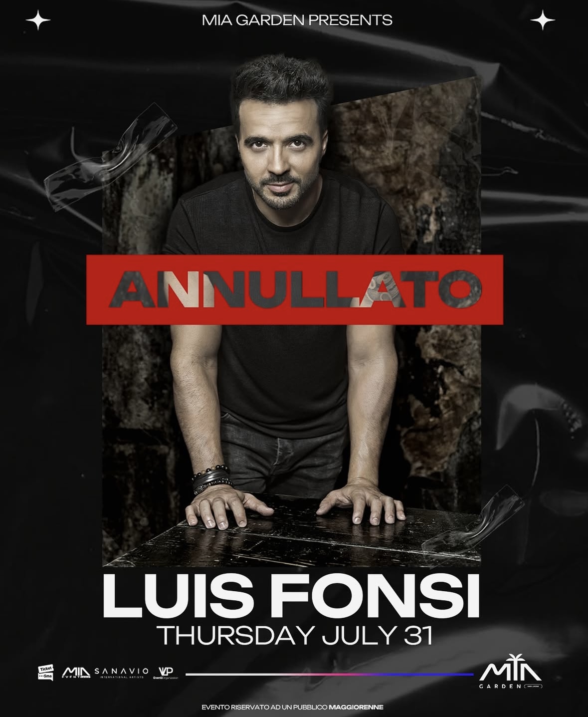 È ufficialmente annullata la data unica in Italia dell’artista internazionale Luis Fonsi, prevista per il 31 luglio al Mia Garden. A comunicarlo, con rammarico, sono direttamente gli organizzatori, che con amarezza spiegano: