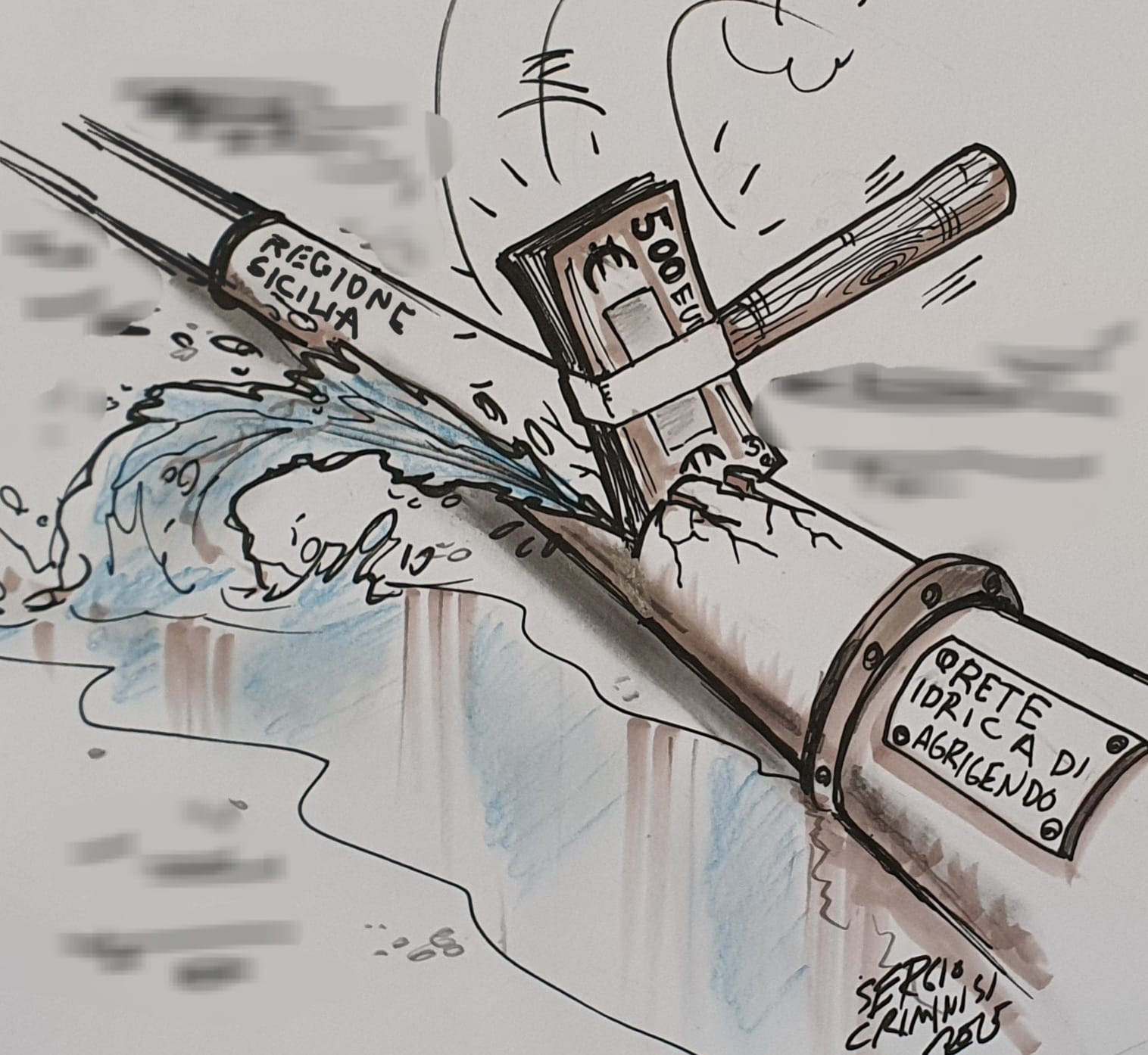 L’immagine è chiara: una condotta idrica marcata “Regione Sicilia” che perde acqua in ogni direzione, una banconota da 500 euro a mo’ di mazza usata per spaccarla ulteriormente, e una targa inequivocabile: “Rete idrica di Agrigento”. Il messaggio? La rete idrica è stata ammazzata a mazzate… da mazzette.