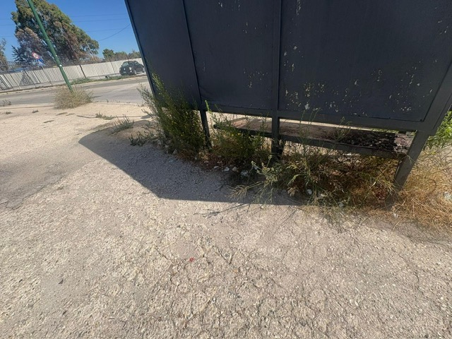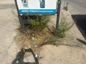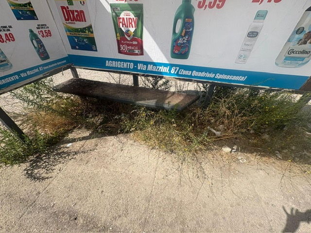 Cartelloni pubblicitari e pensiline soffocate da erbacce e sporcizia.