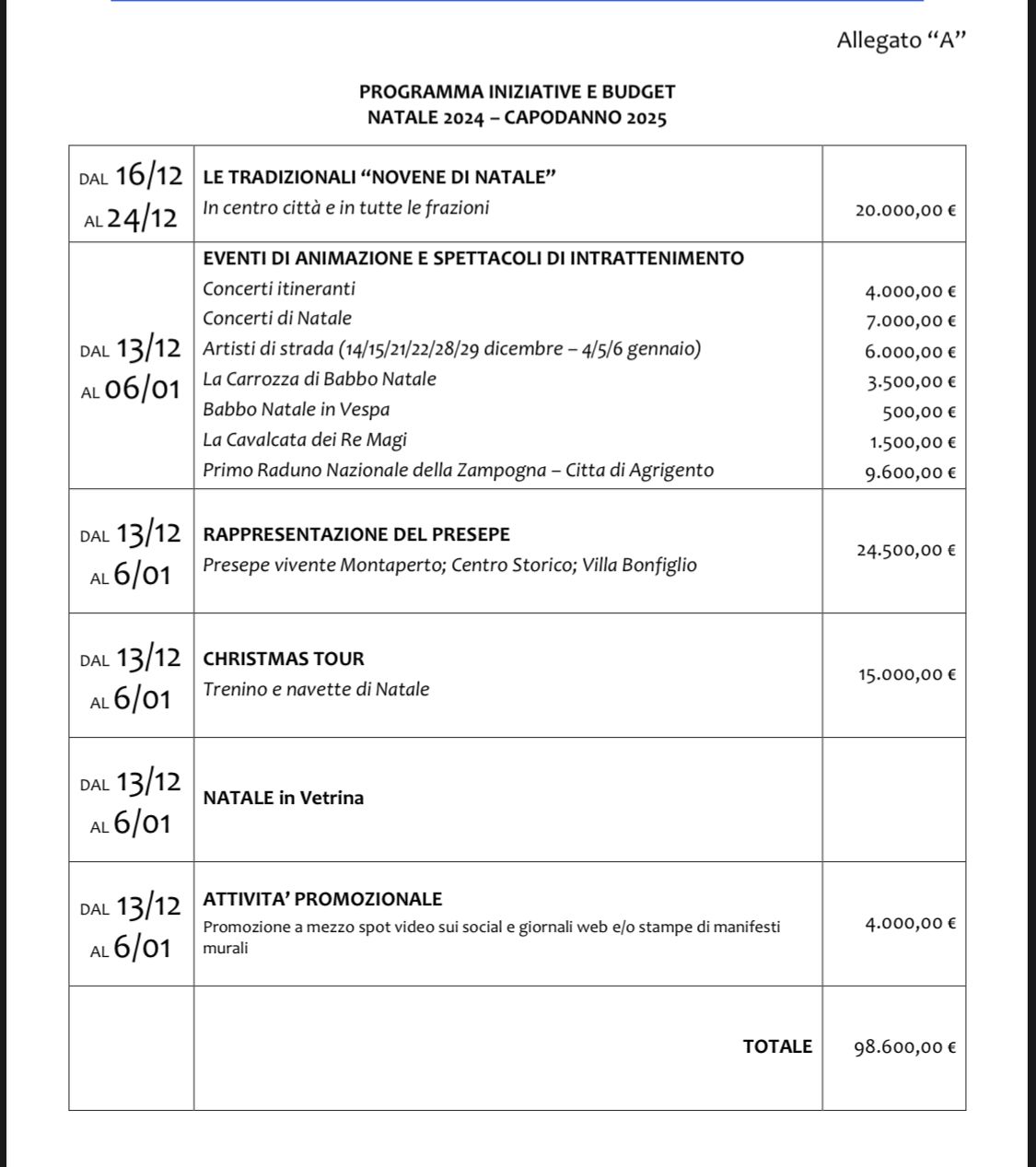 Agrigento celebra il Natale 2024, ma a fare notizia non sono solo le luci e gli eventi, bensì le spese folli e la totale mancanza di trasparenza da parte dell’amministrazione comunale. Come già evidenziato in un precedente articolo, il Comune non ha pubblicato il dettaglio delle spese relative alle iniziative culturali natalizie, limitandosi a fornire una delibera generica.