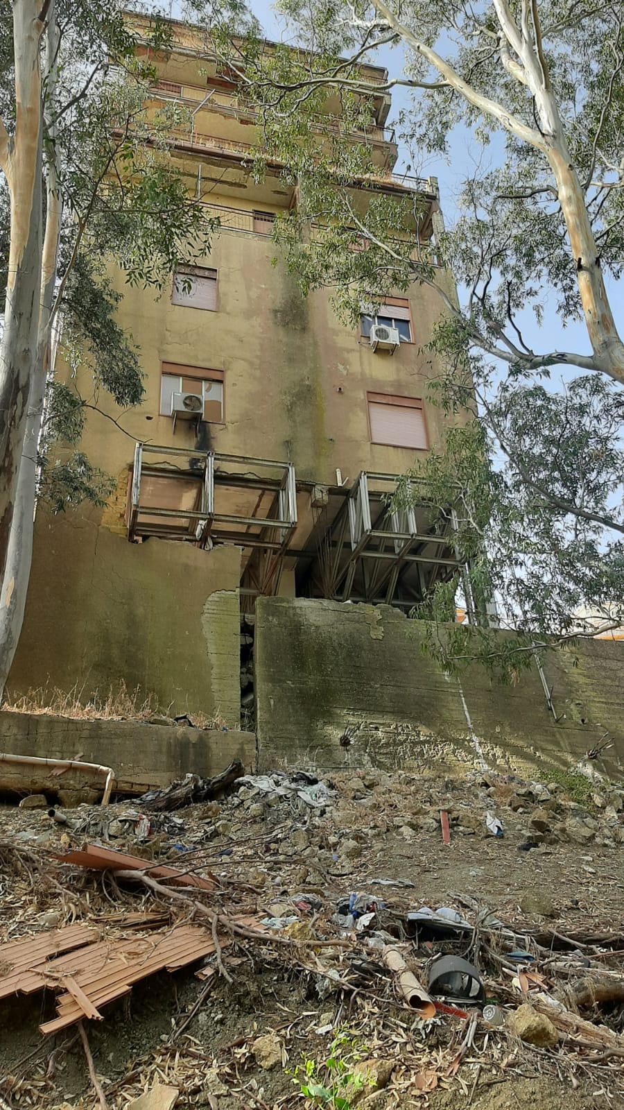 Svetta disabitato da anni tra la via Imera e la rotatoria che conduce al Quadrivio Spinasanta. Non proprio una zona nascosta di Agrigento e nemmeno celata tra i vicoli del centro storico. E’ un imponente palazzo di 5 piani da diverso tempo senza inquilini, trasferitisi altrove. Liberato poco a poco e col tempo andato via via deteriorandosi, come si vede a occhio nudo. Non serve essere ingegneri o architetti per intuire che la situazione necessiti di interventi importanti. Una struttura sulla quale alcuni anni fa vennero effettuati interventi di consolidamento alla base. E meno male. Scendendo infatti nel boschetto attiguo, si nota una imponente struttura metallica, posizionata proprio con l’intento di sorreggere dalle fondamenta questo “immobile”, prima che possa sprofondare definitivamente. Un intervento certamente decisivo, in attesa che i responsabili del fabbricato si mettessero d’accordo su come intervenire per la messa in sicurezza definitiva.
