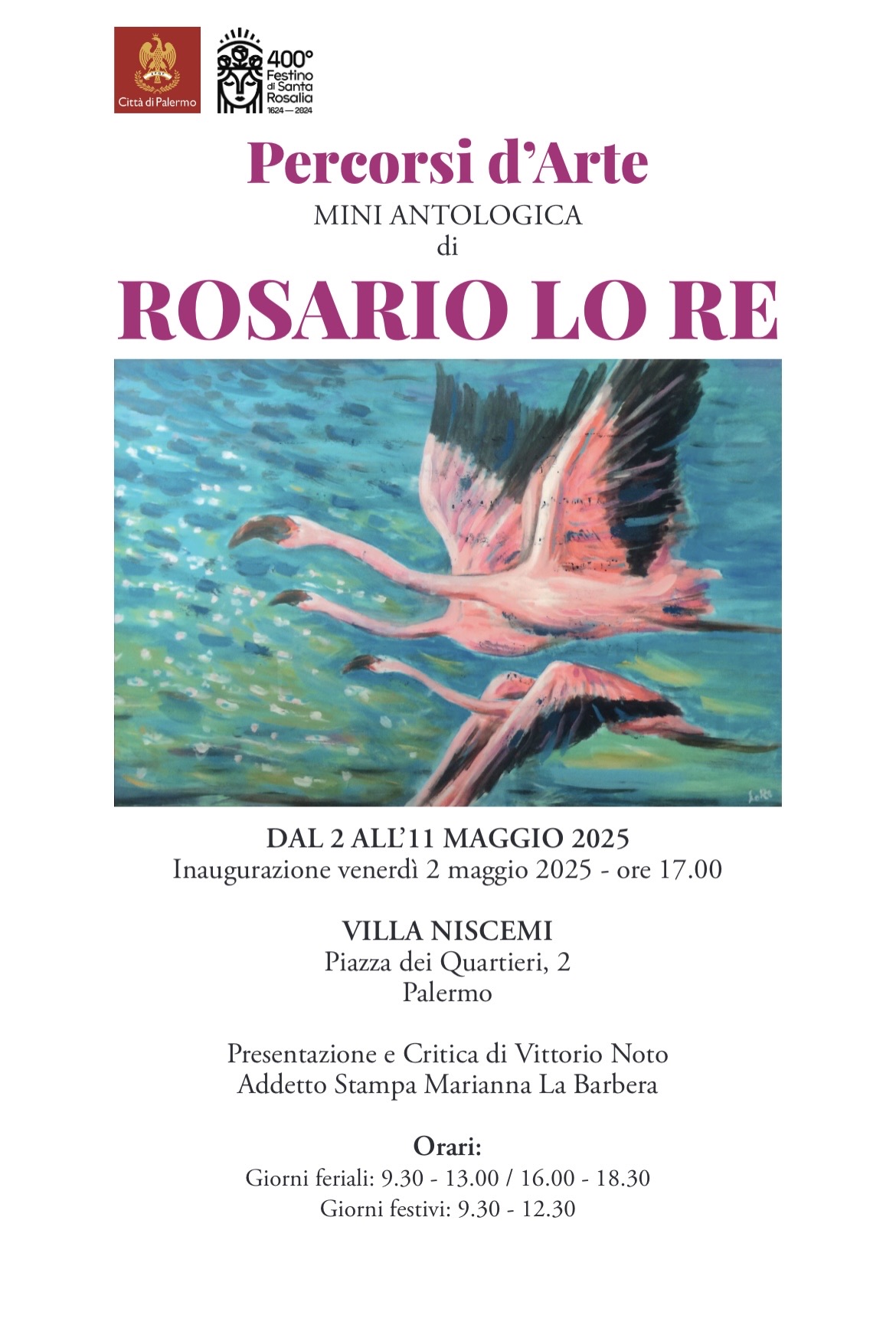 “Percorsi d’arte” è il titolo della mini antologica dell’artista palermitano Rosario Lo Re, in programma a Villa Niscemi, in piazza dei Quartieri 2 a Palermo, dal 2 all’11 maggio.