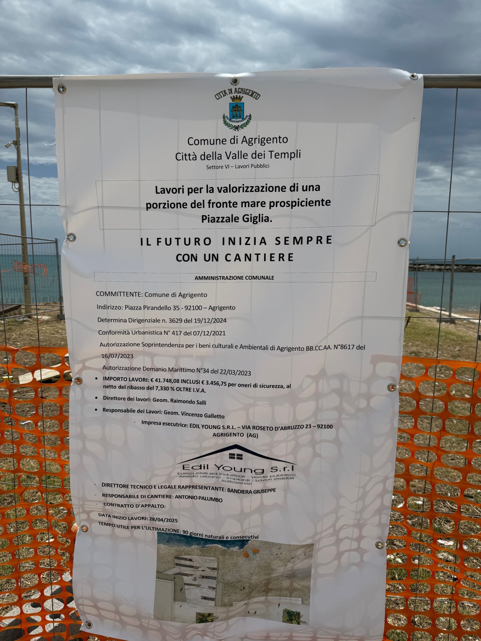 Il cartello di cantiere installato dal Comune di Agrigento annuncia l’opera di “valorizzazione di una porzione del fronte mare” con una previsione di completamento in 90 giorni naturali e consecutivi, entro luglio 2025. Il progetto, affidato alla ditta Edil Young S.r.l., ha un costo complessivo di € 41.748,08, inclusi gli oneri di sicurezza .