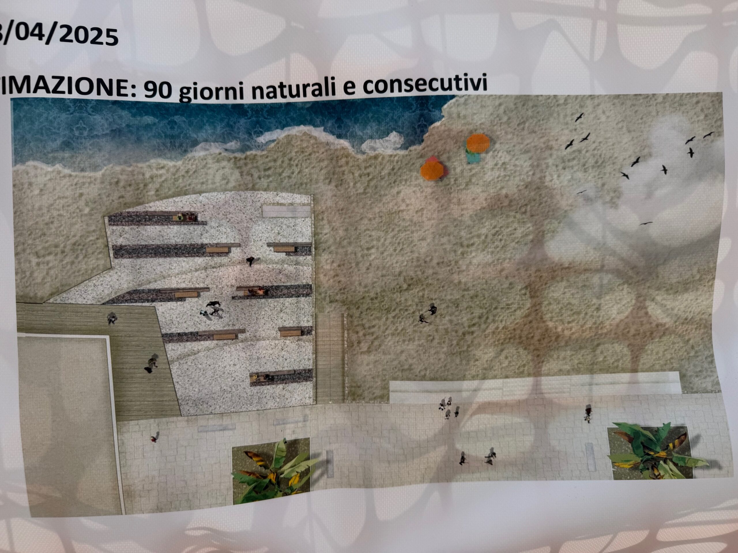 Dalle immagini affisse sul pannello informativo, il nuovo solarium sarà composto da pedane a ridosso della spiaggia, panche, spazi liberi e punti d’ombra, offrendo così un luogo di relax e socializzazione direttamente affacciato sul mare. Una soluzione semplice ma efficace, che risponde alla richiesta di riqualificare gli spazi pubblici a costi contenuti, senza inutili sprechi.
