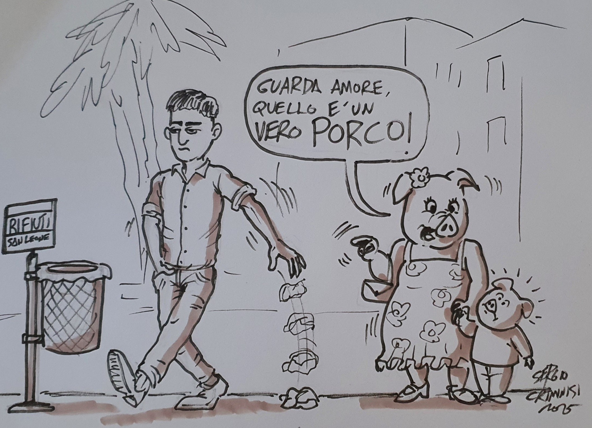A commentare con sarcasmo e indignazione è il disegnatore satirico Sergio Criminisi, con una vignetta che colpisce nel segno: una mamma-maialina mostra al suo piccolo un uomo che getta rifiuti per terra accanto a un cestino, dicendo: “Guarda amore, quello è un vero porco!”.
