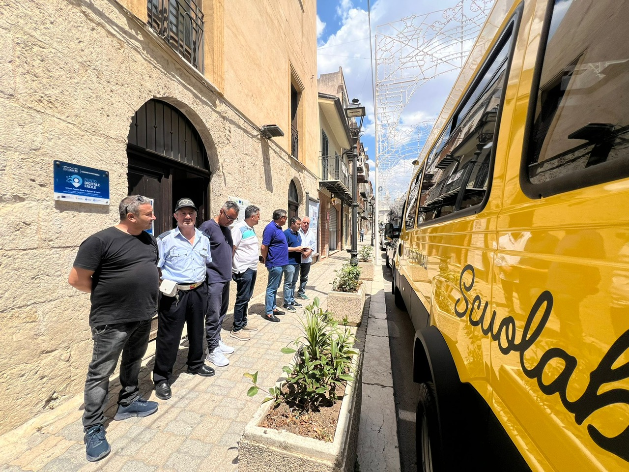 La cerimonia si è svolta di fronte al Palazzo di Città alla presenza delle autorità comunali, del parroco Don Aldo Sciabbarrasi — che ha impartito la benedizione al veicolo invocando protezione per i giovani passeggeri — e di numerosi cittadini.