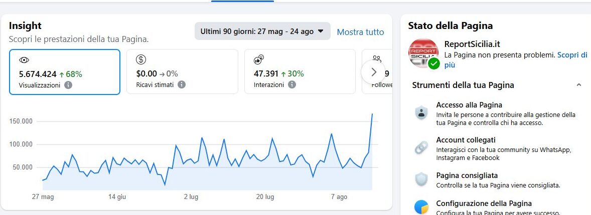 Agrigento – Report Sicilia continua a crescere e a imporsi come una delle realtà giornalistiche più seguite sul territorio. I dati della dashboard professionale di Facebook parlano chiaro: negli ultimi 90 giorni, dal 27 maggio al 24 agosto, la pagina ha registrato numeri da record.
