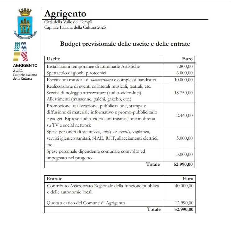 Agrigento – Doveva essere una festa tradizionale, sobria, finanziata con un contributo regionale da 40.000 euro, con un cofinanziamento comunale di 12.990 euro. Così almeno aveva stabilito la delibera di Giunta n. 52 del 2 aprile 2025 GC_52_2025 PGT San Calogero 2025, con cui il sindaco Francesco Miccichè e gli assessori chiedevano ufficialmente un finanziamento per i festeggiamenti in onore di San Calogero ai sensi dell’art. 4 della Legge Regionale n.1 del 16 gennaio 2024.